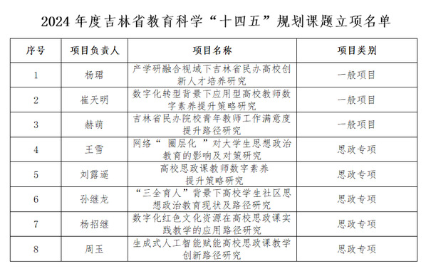 近日,吉林省教育科学研究领导小组发布了2024年度吉林省教育科学“十四五”规划课题立项名单,金沙官网获批8项,其中一般项目3项,思政专项5项。学校高度重视吉林省教育科学“十四五”规划课题申报工作,组织相关学科专家对申报项目进行评审并提出修改意见和建议,切实提升项目申报质量,立项数量较上一年度有显著增长。