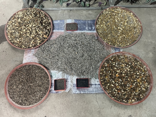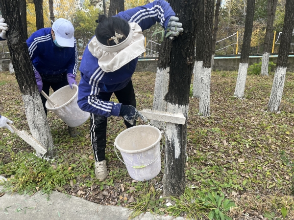 科学配比石灰、工业盐比例,对全校定粗以上树木进行刷白防护,起到保温、防虫害作用。针对冬季天井绿植高发腻虫现象,提前喷洒农药。此外,采集、晾晒花籽,为明年的育苗工作做好准备。