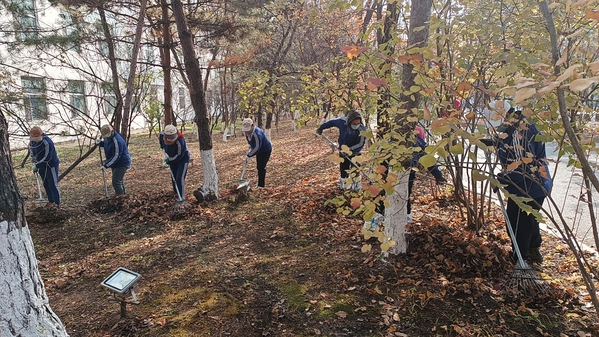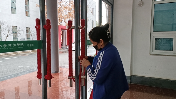 组织清理绿化带的枯枝落叶,降低灰尘,美化校园,同时起到安全防火作用。为公共楼宇大门缠绕防护把手,解决门把手冰手的细小问题,为校园增添温馨感。