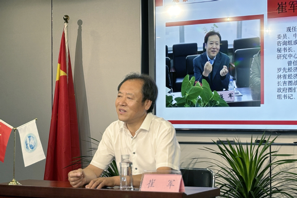 下午,吉林省政协常委、吉林省委决策咨询委员崔军就上合国家多边组织合作关系、长吉图战略实施和东北亚合作关系、聚焦东北亚铁路集团和图们江区域合作开发及学校如何服务区域经济社会发展方面作专题报告。