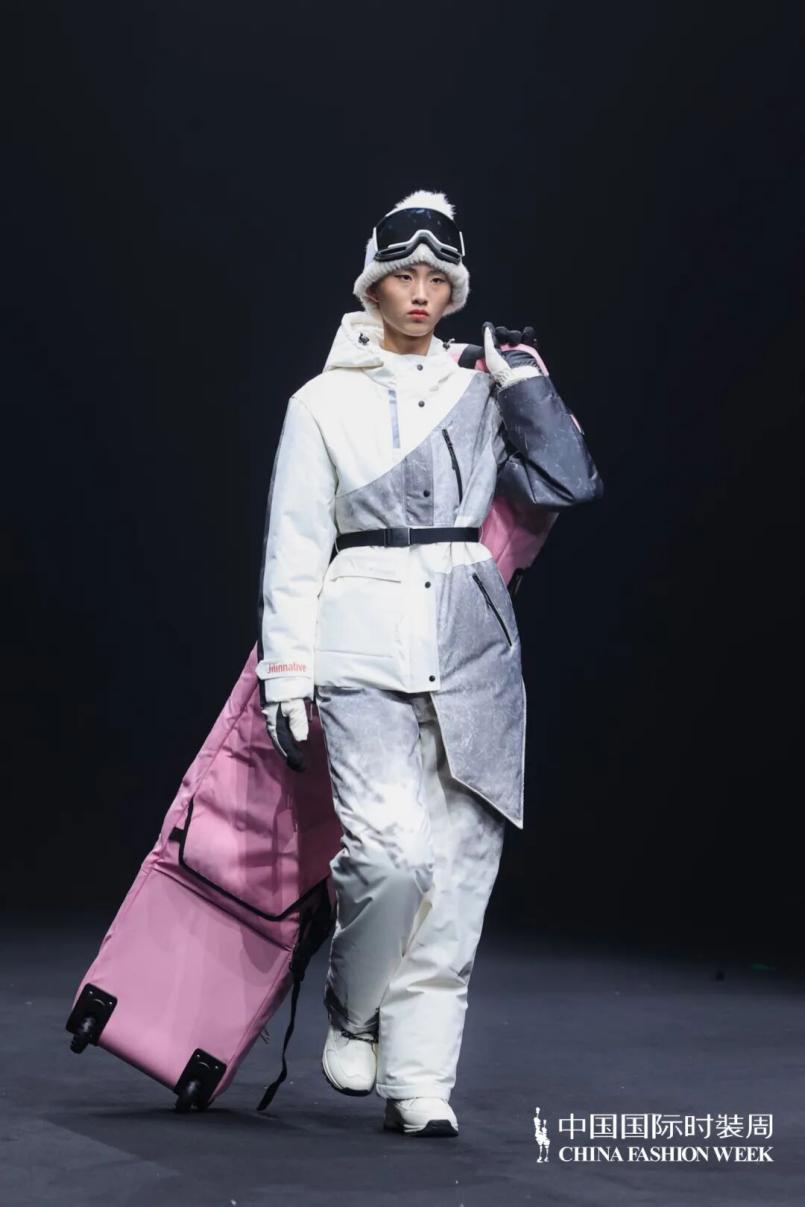 本次“冰雪吉人”品牌在中国国际时装周上共发布了四个系列作品,其中尤为引人注目的是“雪意”系列。该系列由服装2022级学生郭俐设计,其创作主题“水墨长白,雪境穿行”深深植根于吉林地域文化。设计灵感源自雄伟的长白山,通过提取山峦的轮廓线条,并巧妙运用中国传统水墨画的晕染技法,将长白山的壮丽山水与静谧雪景创造性地点缀于功能性服饰之上,既展现了冰雪运动的活力,又传递出深邃的传统美学韵味,实现了艺术与实用的完美结合。