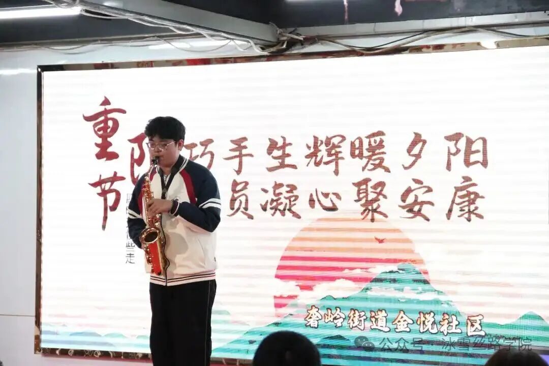 活动伊始,一场暖场表演为现场注入了别样温情,学院25级视觉传达设计的张家硕同学,手持萨克斯奏响悠扬曲目。舒缓的旋律萦绕在养老院的每个角落,既驱散了秋日的微凉,又用音乐传递着青春群体的问候,为后续的敬老环节温柔拉开序幕。