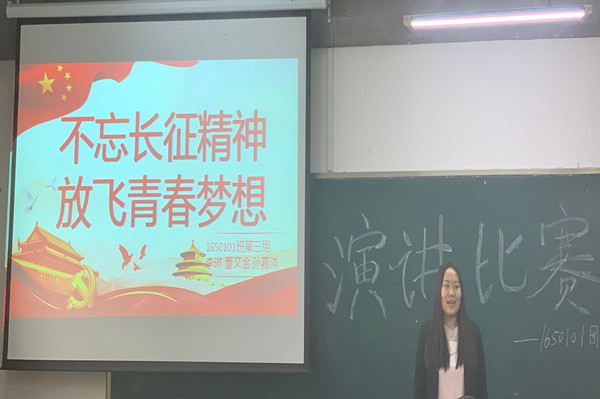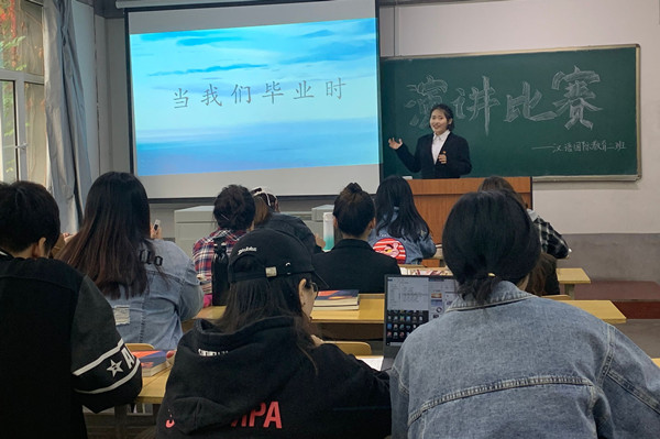 此次活动结合演讲与口才课程教学内容,组织16级汉语国际教育专业全体学生参加,每3-4人编为一组,共分为18组。每组组员分工明确,分别进行选择主题、写作文稿、制作演示文稿等工作,最后选派一位学生代表登台演讲。在比赛过程中,参赛选手个个衣着得体、精神抖擞,演讲主题丰富多样:有对时光易逝的慨叹,有对成长路上的感恩,有自己内心最初的坚持,更有对祖国的无限热爱。此次演讲主题突出、情绪饱满、声情激昂、音节铿锵,同学们用极富感染力的神态动作和语言表达引得台下阵阵掌声。经过激烈角逐,共选出了五组优秀选手选送6月举行的院级赛。