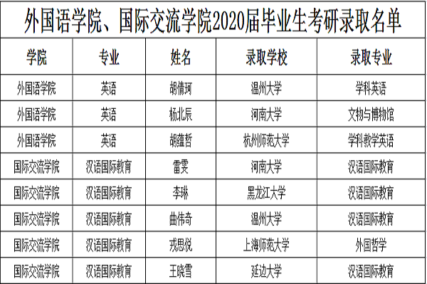 外国语学院、国际交流学院2020届毕业生在全国研究生考试中不负众望,再创佳绩。共有8名同学成功考取硕士研究生,其中不乏河南大学、延边大学等双一流学科建设高校以及黑龙江大学、上海师范大学、杭州师范大学、温州大学等国内知名院校,我院考研率,名校录取率逐年攀升。