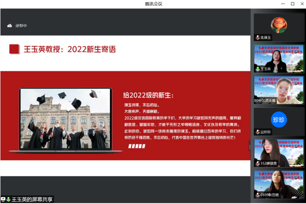 此次线上见面会不仅增进了我院师生之间的凝聚力,架起了师生之间沟通的桥梁,同时也让2022级新生对汉语国际教育专业有了更多的了解与更好的认识,对于他们能够快速的融入大学生活、养成良好的生活习惯以及人生的长远发展都有重大的现实意义。