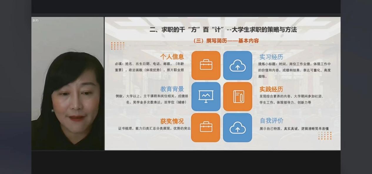 宁波大学就业指导中心老师王洪影主讲。她首先介绍自己是“就业战线上的奋斗者”、“教书育人的践行者”和“陪伴学生成长的启发者”;接着,她从大学生面临的就业形势入手,为学生介绍了近几年的就业情况并分析了当前的就业形势,然后切入求职方法和计策,为学生讲解如何高质量的匹配求职岗位,尤其是在解读招聘信息和撰写个人简历方面,为许多面临求职的同学们理清了思路并指引了方向,使之更加明确自己如何高质量的求职。最后她向同学们介绍了大学生的求职正道,强调了一些就业前的准备工作,应具备的专业知识和能力,具备的良好心理素质和求职技巧等。