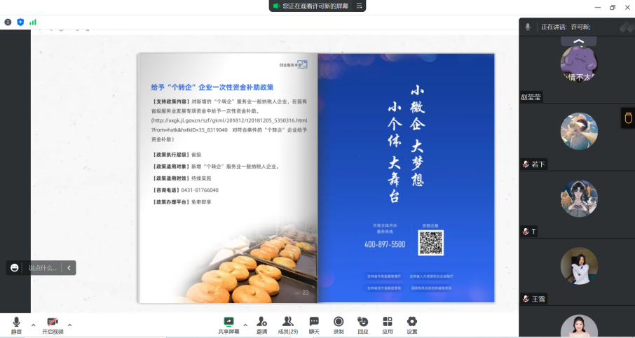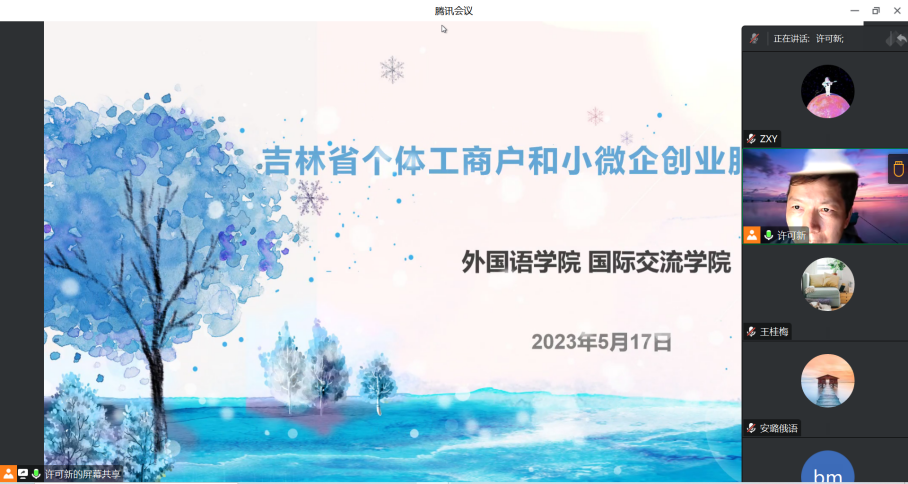 为深入贯彻党中央、国务院和省委、省政府扶持个体工商户发展的部署要求以及促进我院毕业生更加充分更高质量就业创业517日晚,外国语学院、国际交流学院举行学习《吉林省个体工商户和小微企业创业服务手册》线上报告会,会议由副院长许可新主持,英语教研室主任王桂梅、日语教研室主任鲍永辉、俄语教研室主任安璐、23届毕业生辅导员殷悦出席此次会议,我院23届部分学生参加会议。
