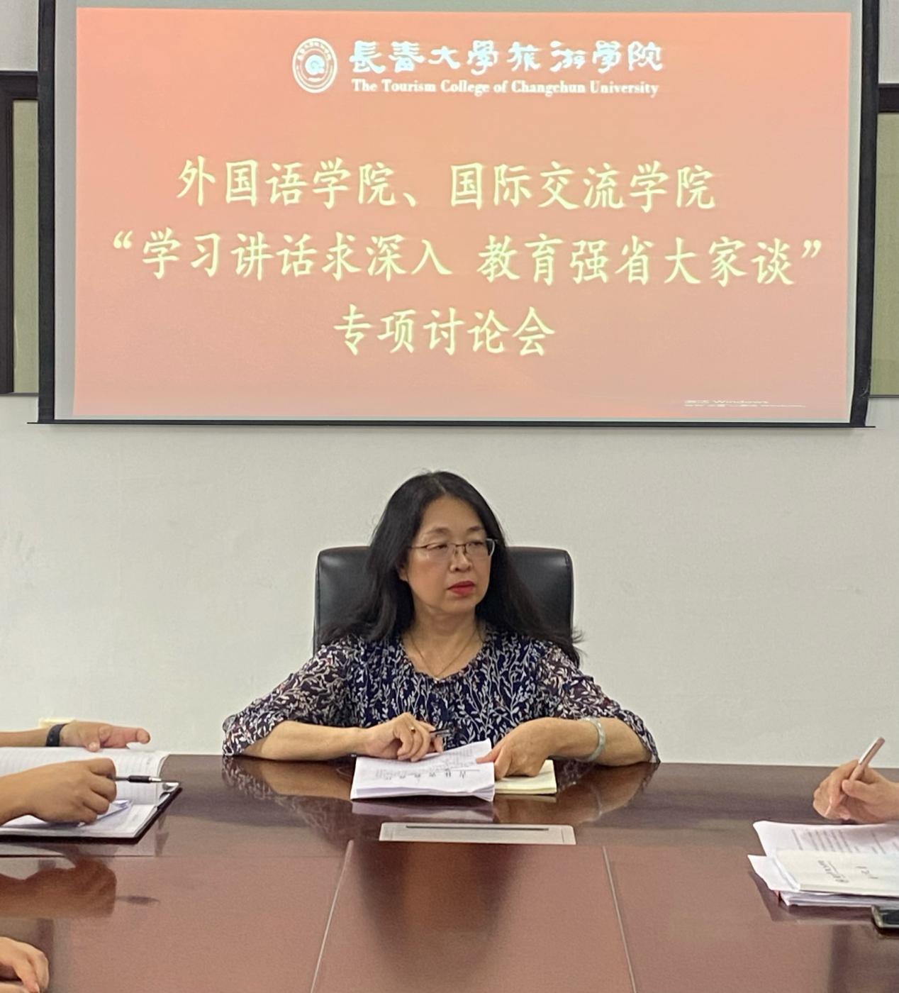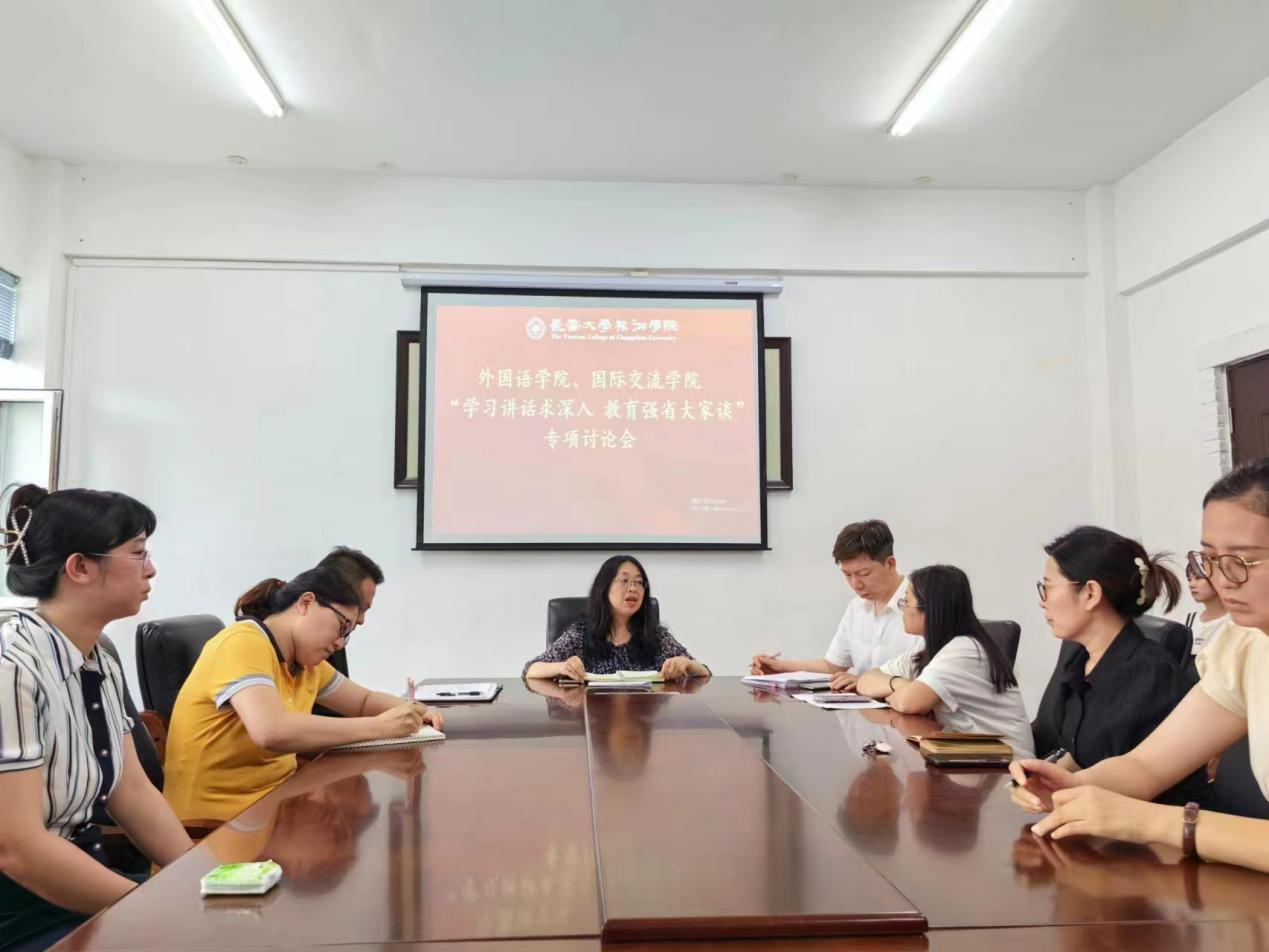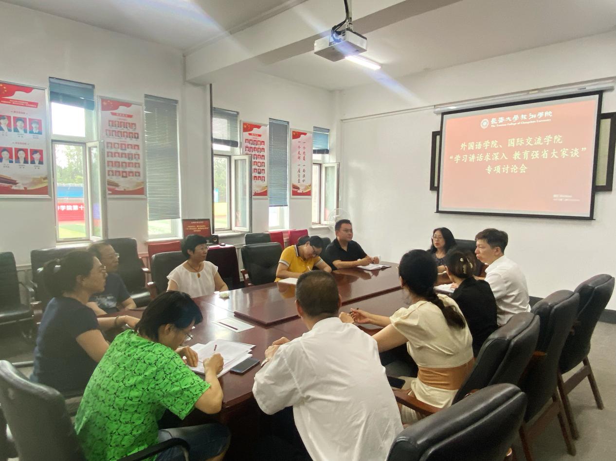 为扎实推进学习贯彻习近平新时代中国特色社会主义思想主题教育,深刻领会习近平总书记在中共中央政治局第五次集体学习时关于教育强国的重要讲话精神,结合省教育厅下发的《关于开展“学习讲话求深入 教育强省大家谈”大讨论活动通知》要求,7月14日下午,外国语、国际交流学院在综合楼201会议室开展了以“学习讲话求深入、教育强省大家谈”为主题的专项讨论会。外国语学院、国际交流学院院长彭又新、党总支副书记蒋森、副院长许可新、副院长王丹、专业带头人、教研室主任以及各专业骨干教师参加讨论会。会议由彭又新主持。