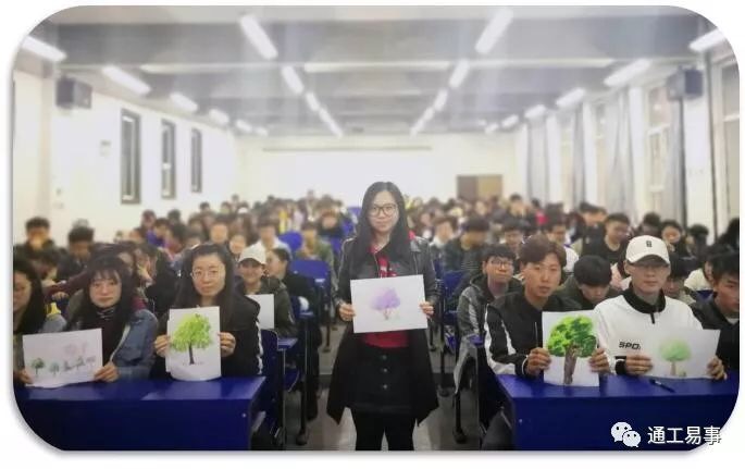 活动中,同学们都积极参与,用事先准备好的笔画出了自己心中的树,并给树涂上了颜色。随后李菁老师走下讲台对同学们画的各种形态的树作出了分析。通过分析不同同学的画作,发现有的同学对未来迷茫、有的同学性格爱较劲、有的同学害怕孤独等等,同学们听到这些分析,都觉得被猜中心思,但又不得其解。最后导员对此进行心理学的专业解释,原来是根据树的各种形态进行分析的,同学们恍然大悟并欢笑一片。