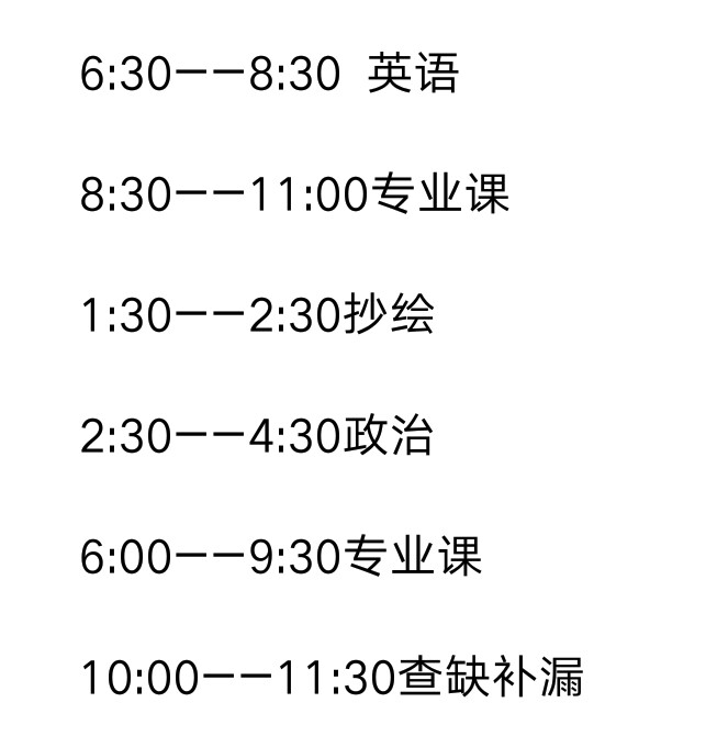如果你有考研的想法,建议提早开始。从大三下学期开始就要准备英语了,每天要坚持背单词,尽量不要有间断,如果觉的自己的英语能力不行,可以选择报个班,这样可以系统的学习。下面的是我后期的时间利用情况,可以参考,但具体学习时间可以根据自己的具体情况而定。