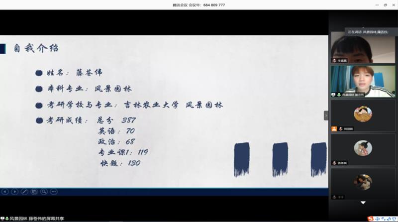 本次交流会邀请了我院2016级考取研究生成功的学生代表:藤苍伟、岑科婕、罗合一、周崟丹、任可、于帅,做线上考研经验交流。六位同学就自己的备考经历,院校选择、学习体会、心路历程、应对技巧,考研复试的时间与流程、疫情特殊时期的考情变化、注意事项等大家关心的问题进行了经验分享。随后在线上与学弟学妹们进行了热烈的互动交流,参与经验交流会的学生代表提出了自己在学习和规划过程存在的困惑和疑问,考研成功的同学为他们耐心解答。