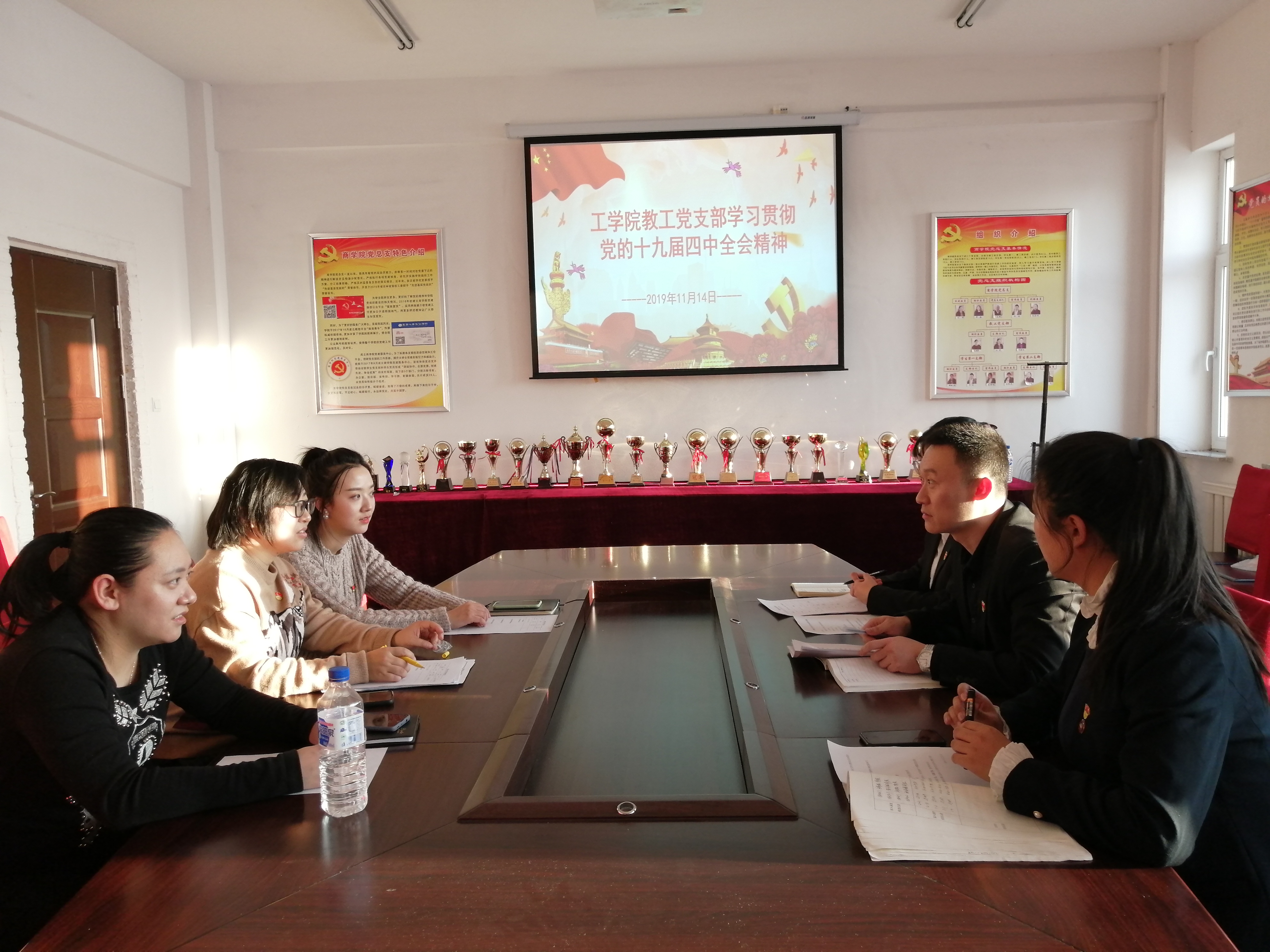 刚刚闭幕的党的十九届四中全会,是在庆祝新中国成立70周年的重要节点,向全面建成小康社会、实现第一个百年奋斗目标迈进的关键之年召开的一次重要会议。为贯彻党的十九届四中全会精神,11月14日,工学院教工党支部在综合楼208开展了学习活动。