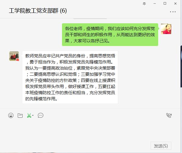 刘玮同志表示:在特殊时期的教学要用一个灵活的方式向学生传达一边防控疫情、一边做好本职的学习任务;建立通畅的沟通途径,让学生没有学习的顾虑。做好一名党员教师的模范作用,给学生做榜样、做后盾。