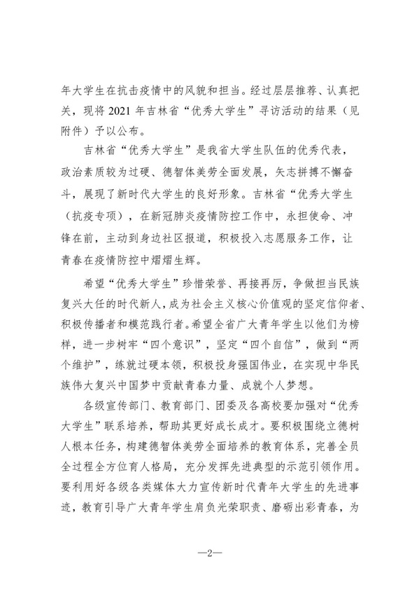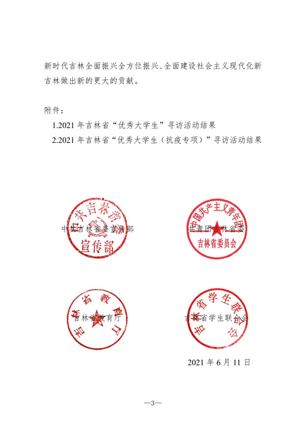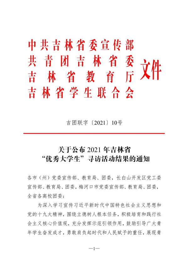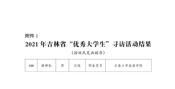 2021年吉林省“优秀大学生”寻访活动自20213月启动以来,各高校踊跃参与,全省共评出100名优秀大学生。