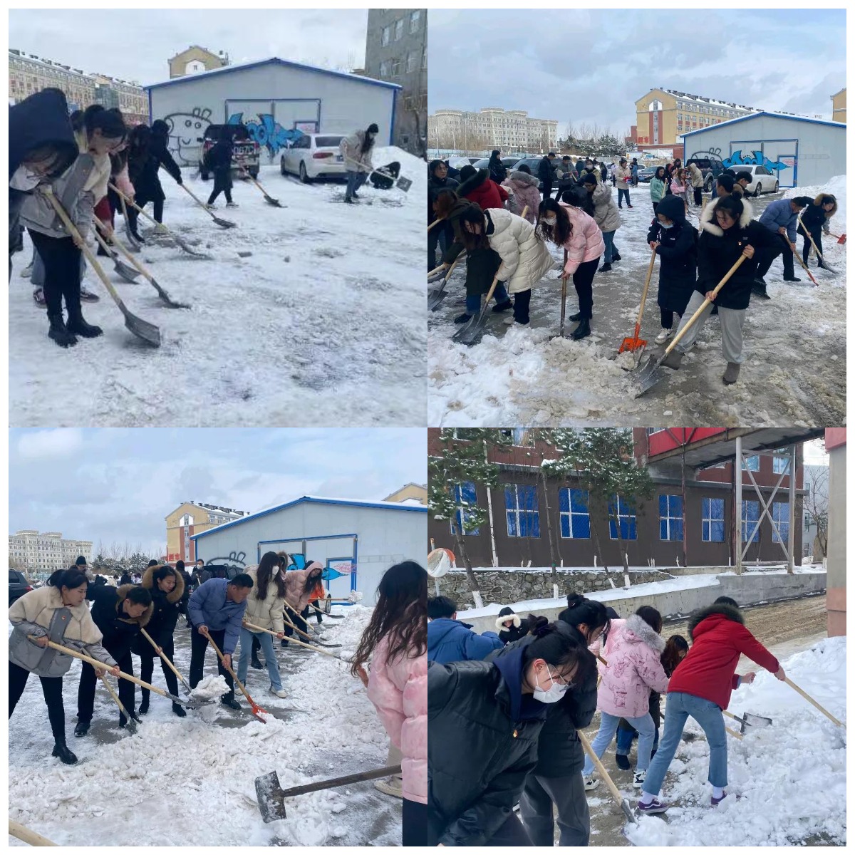 党员们带着工具来到停车场,积极迅速的开展扫雪活动。他们分工明确,有的负责清扫路面积雪,有的负责铲除路面的冰块。铁锹声和师生们的话语声交织在一起奏出一首和谐的劳动交响曲在校园中回荡。