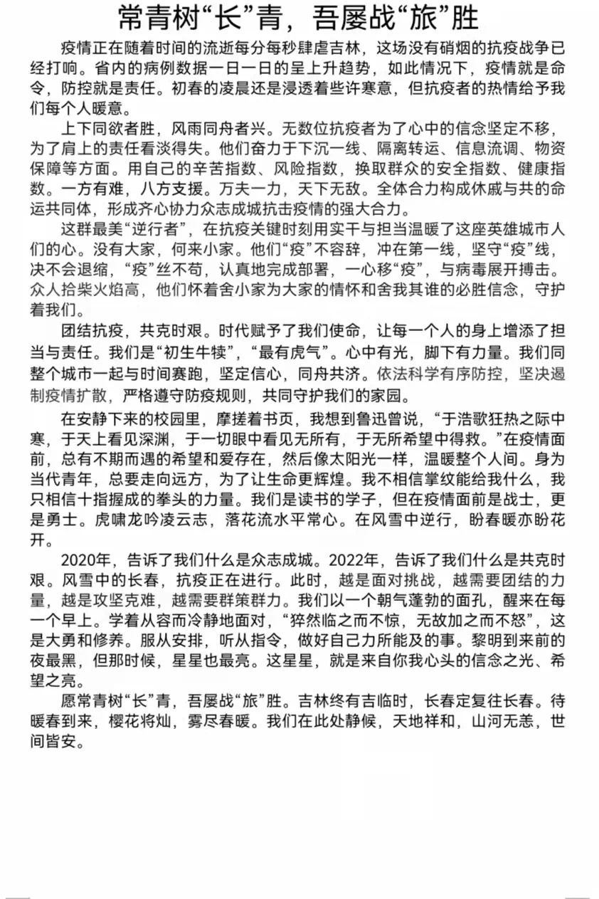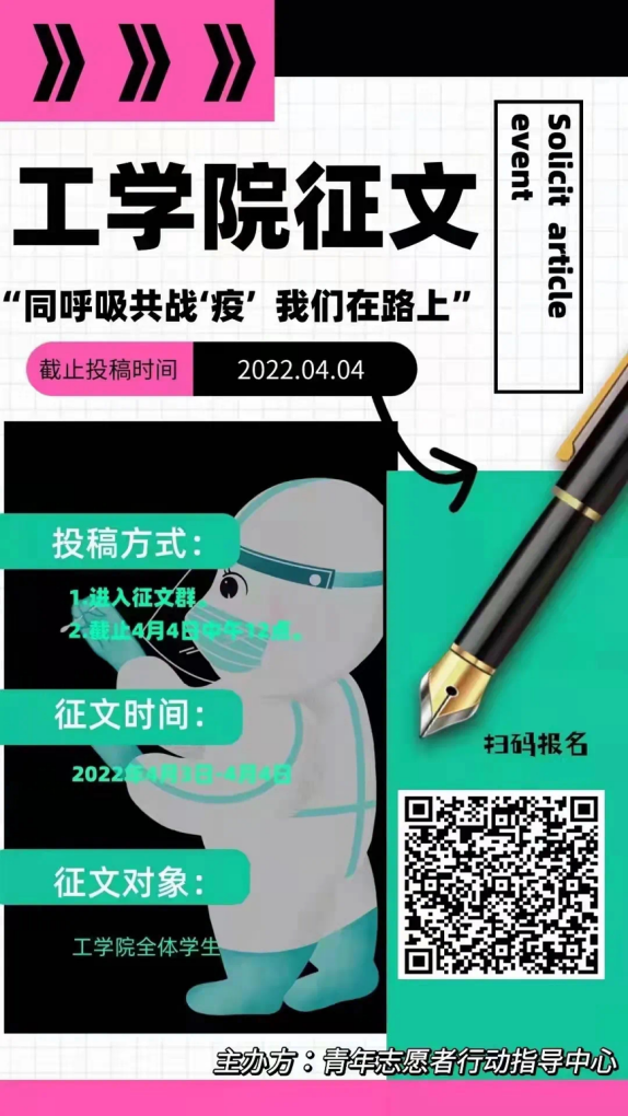 为响应国家号召,丰富学生们的课余生活,记录防疫阻击战中最值得铭记的时刻,呈现出长旅人防控中感动人心的精神风采,工学院青年志愿者行动指导中心特此举办了“同呼吸共战“疫”,我们在路上”征文活动。