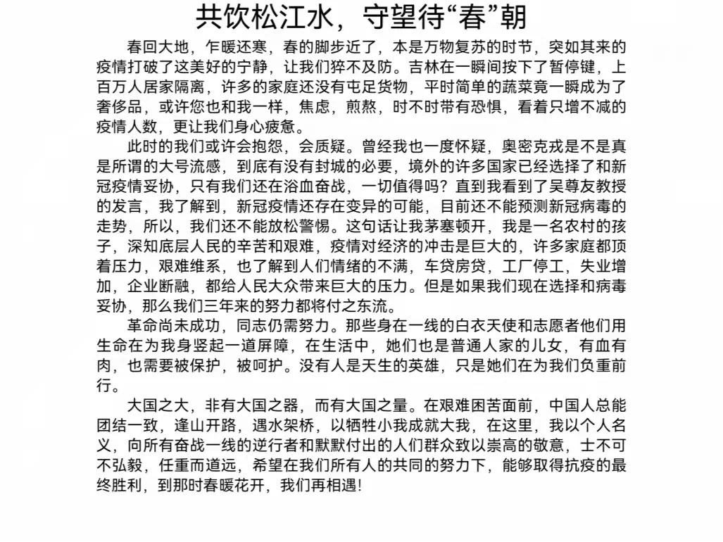 本次活动的顺利举行,弘扬了我院学子的爱国情、爱家情、进一步坚定了同学们的制度自信,培养了大家的社会责任感,让青年学生们学会了感恩。没有一个冬天不会逾越,没有一个春天不会来临,我们听从召唤,服从命令,肩负使命,贡献爱心。我们相信我们深爱的这片土地,一定会等到春暖花开的那天!