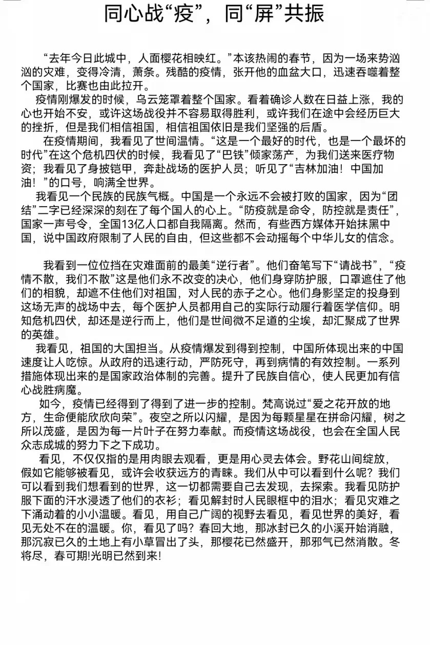 抗击疫情的工作在全国如火如荼的开展着,每个人都在为抗击疫情做着贡献,因此各种各样感人的人和事不断的涌现,在这其中,最能打动你的是什么呢?让我们一起来看看大家的征文作品吧!