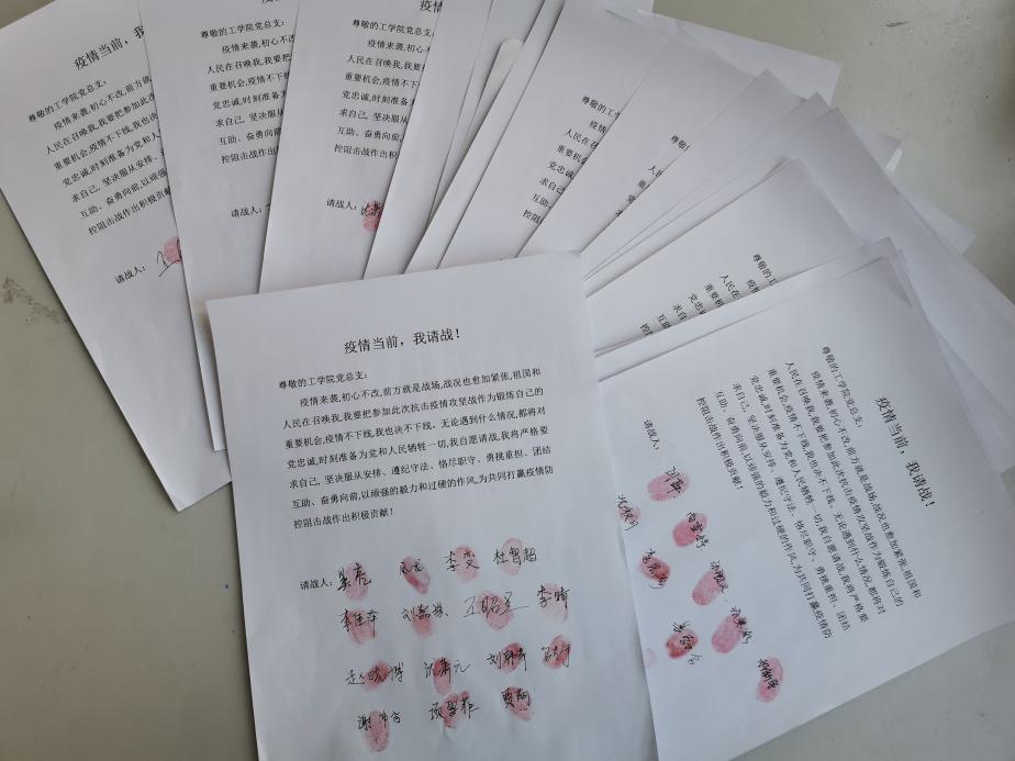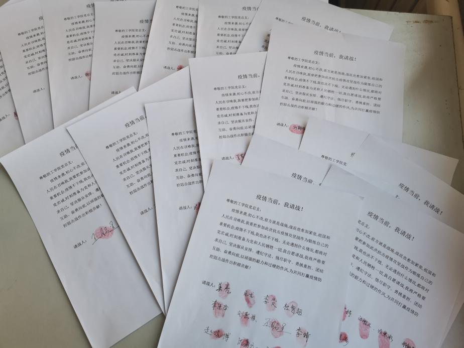 我郑重向学院党总支提出申请,参加抗击新冠肺炎疫情的战斗,请组织批准!随时听从号召,前往疫情防控狙击第一线。”一句句铿锵有力的誓言激荡人心,面对本轮新冠肺炎疫情的严峻形势,工学院学生党支部发挥战斗堡垒作用,全体党员主动请缨,请战书络绎不绝,凝聚起了共同抗击疫情的信心和决心。