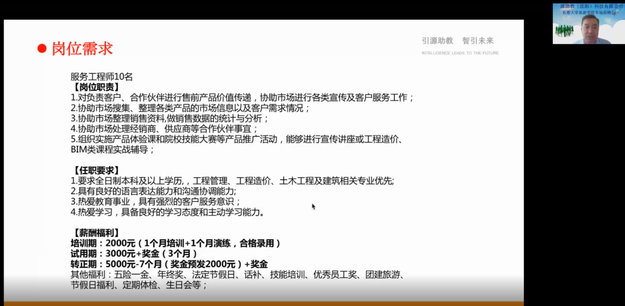 本次招聘服务工程师10名,主要是负责对客户、合作企业进行售前产品价值传递,协助市场进行各类宣传及客户服务工作、协助市场其他工作、组织实施产品体验课和院校技能大赛等产品推广活动,能够进行宣传讲座或BIM类课程实战辅导等。要求学生具备较好表达能力和沟通协调能力,具备良好的学习态度和主动学习的能力。同时,刘瀛也对薪酬福利等事宜与学生明晰,并欢迎各位同学加入本公司实习及就业。