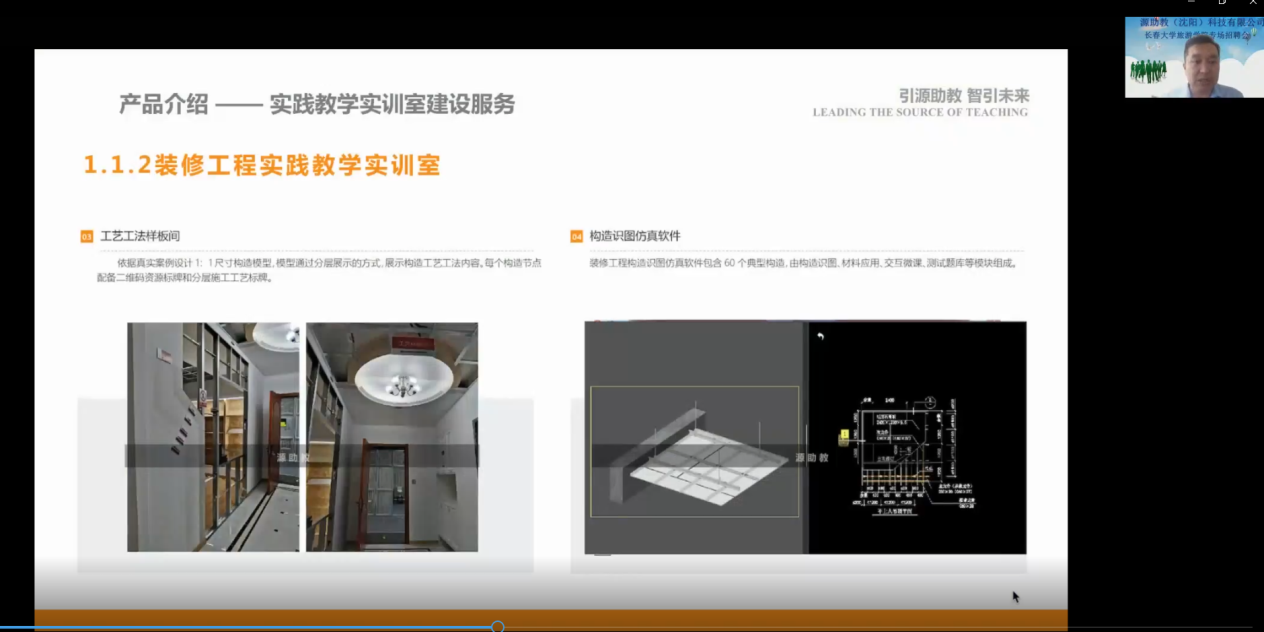 刘瀛从公司发展情况、产品及服务内容介绍、职业发展及岗位需求介绍三个方面展开介绍。源助教(沈阳)科技有限公司是一家致力于为教育现代化提供全方位、全流程技术支持服务的高新技术企业,依据教育现代化的内涵,以服务于教育现代化建设为目标,围绕建筑垂直领域,面向各大院校提供所需数字化教学内容建设、现代信息智能化技术支持及教学设施软硬件一体化整体解决方案集成服务。