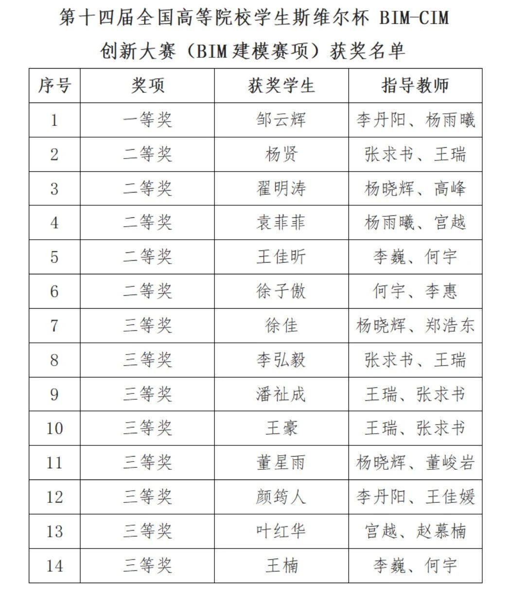 近日,第十四届全国高等院校“斯维尔杯”BIM-CIM创新大赛(BIM建模赛项)落下帷幕,分赛场设在学校筑梦报告厅。我院师生喜获14个奖项。其中,一等奖1项、二等奖5项、三等奖8项。本次获奖在数量和质量上刷新了学校在BIM建模赛项的历史最好成绩,取得了新突破。