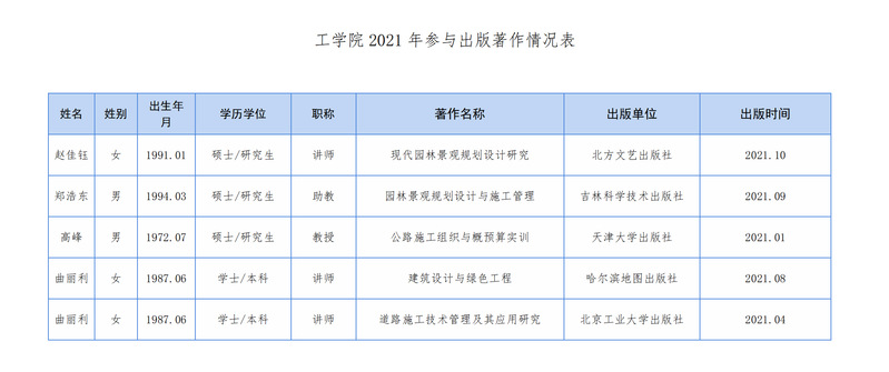 工学院2021年参与出版著作情况表