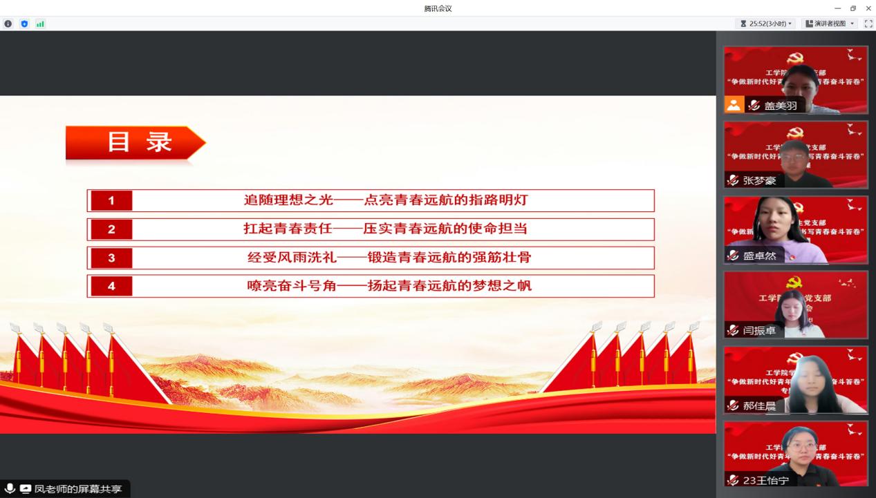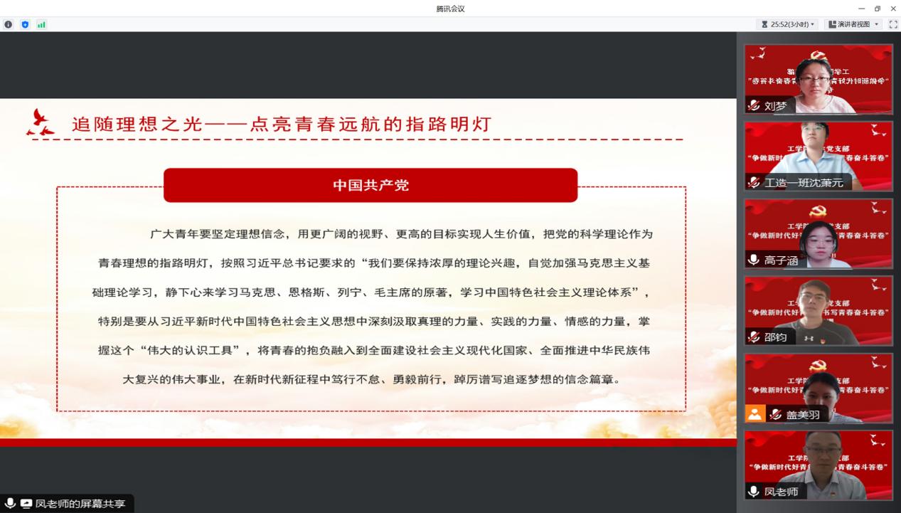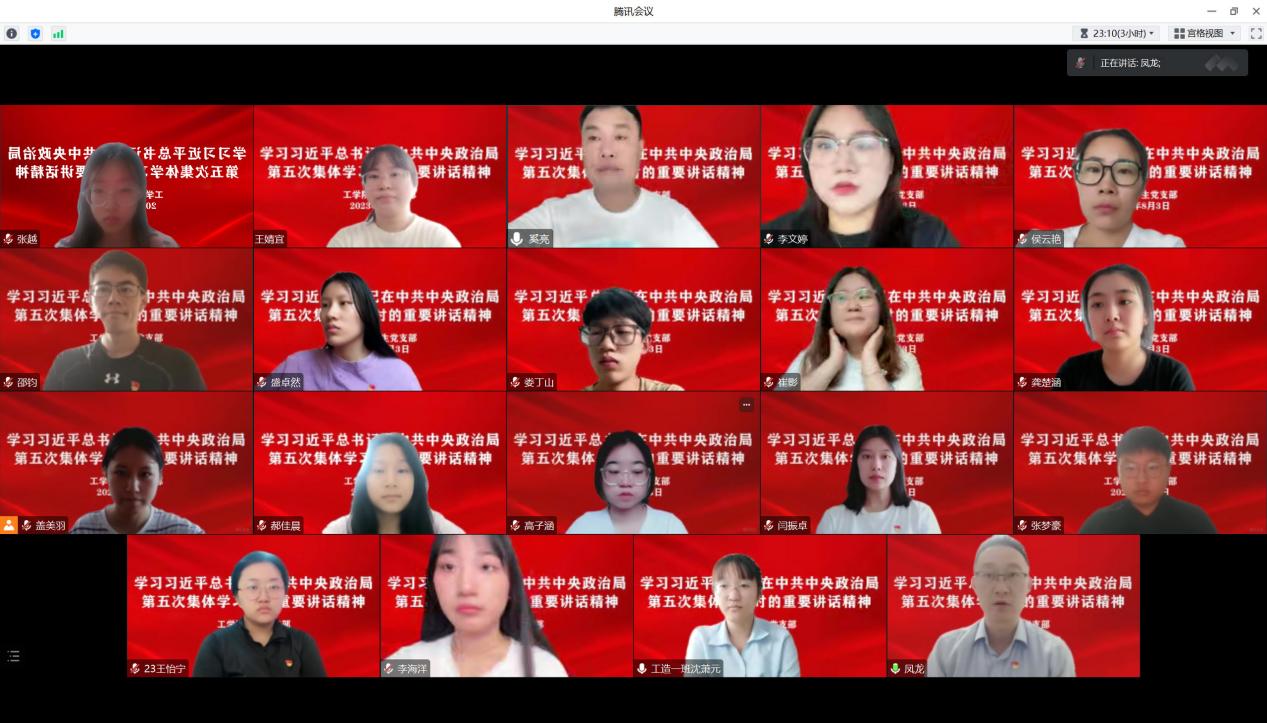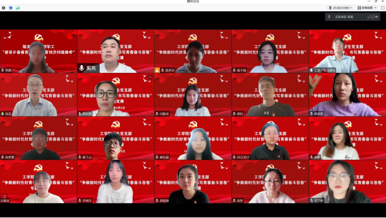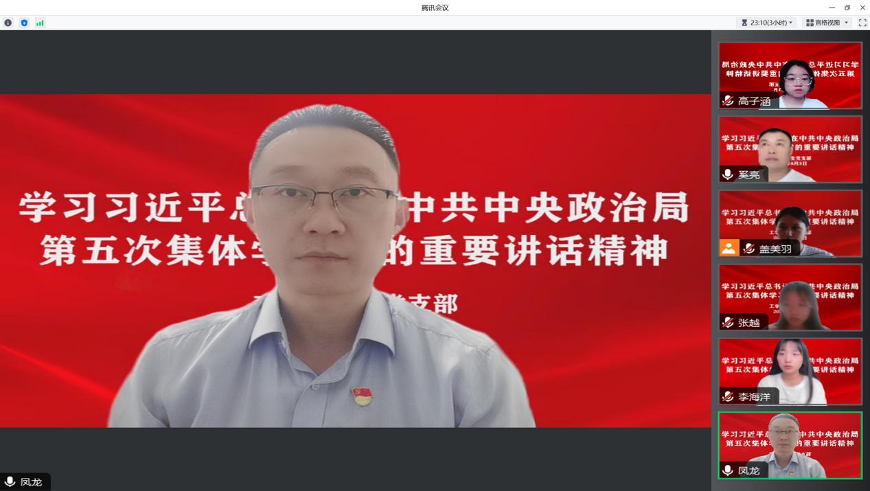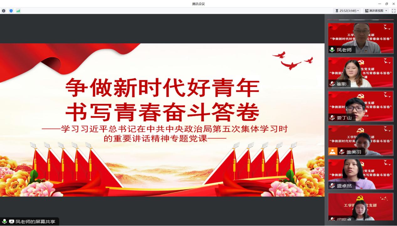 为深入学习贯彻习近平总书记在中共中央政治局第五次集体学习时的重要讲话精神,2023年8月2日,工学院学生党支部开展“争做新时代好青年,书写青春奋斗答卷”专题党课,工学院党总支书记凤龙担任主讲人。