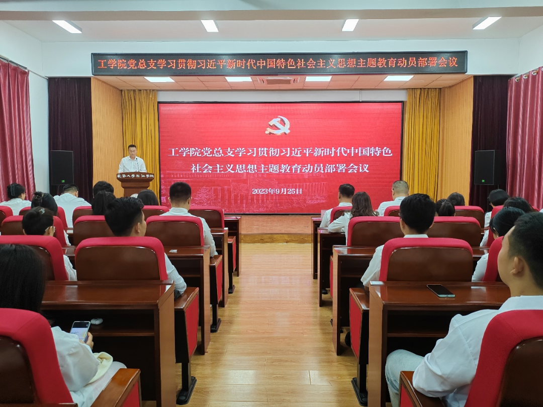 为认真贯彻落实学校党委关于开展学习贯彻习近平新时代中国特色社会主义思想主题教育工作部署,2023年9月25日,工学院党总支在校筑梦报告厅召开学习贯彻习近平新时代中国特色社会主义思想主题教育动员部署会议。工学院院长高峰、党总支书记凤龙、副院长董峻岩以及全体教师、辅导员、学生党员参加了本次会议,会议由凤龙主持。