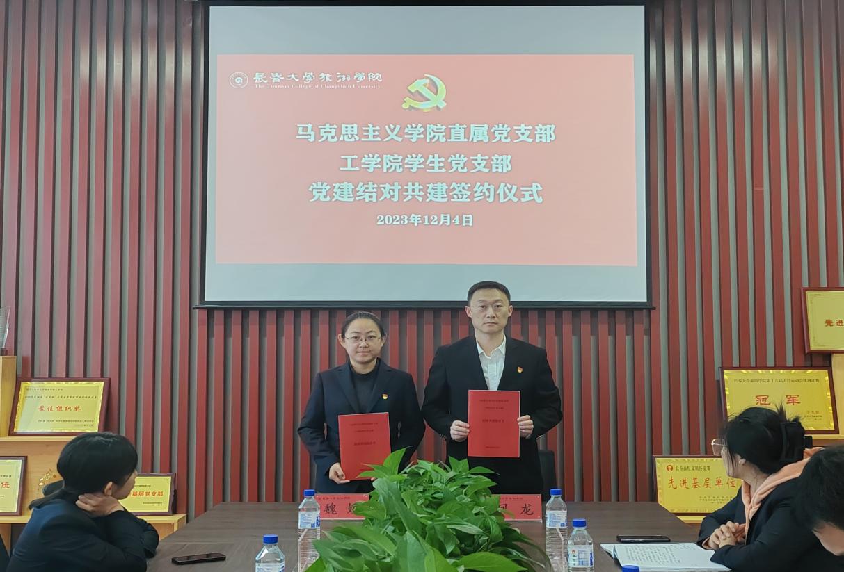 为深入学习贯彻习近平新时代中国特色社会主义思想主题教育,进一步加强党支部建设,创新党建工作方法和载体,实现基层党组织优势互补、共同发展的工作目标,12月4日,工学院学生党支部与马克思主义学院直属党支部“党建结对共建”签约仪式在工学院党建活动室举行。马克思主义学院直属党支部副书记魏娇、组织员袁伟达、形势与政策教研室主任杨芳硕,工学院党总支书记凤龙、组织员奚亮、学生党支部书记侯云艳、宣传委员张晏嘉参加了本次仪式。签约仪式由凤龙主持。