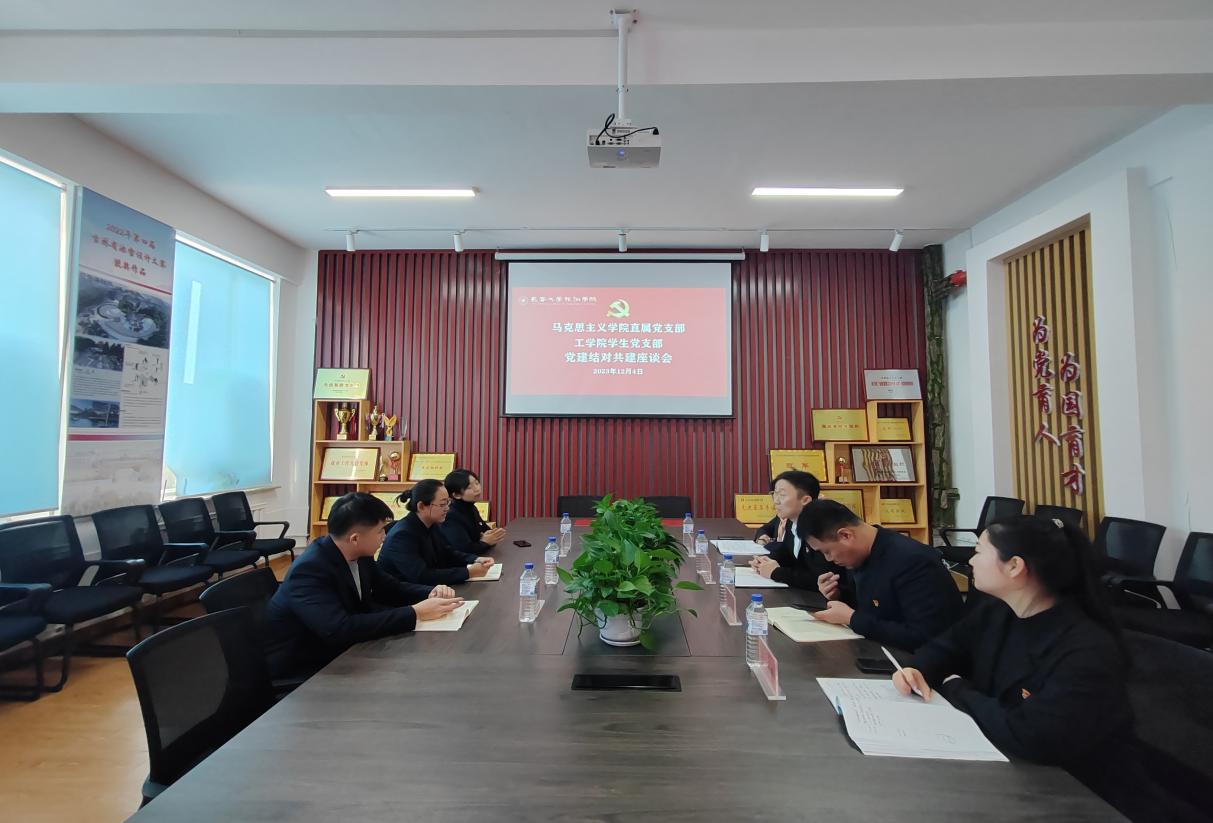 与会领导嘉宾在工学院党建活动室召开了工学院学生党支部与马克思主义学院直属党支部“党建结对共建”座谈会,双方就促进党建引领、加强支部建设、提高党员示范引领作用、进行了深入交流和探讨。