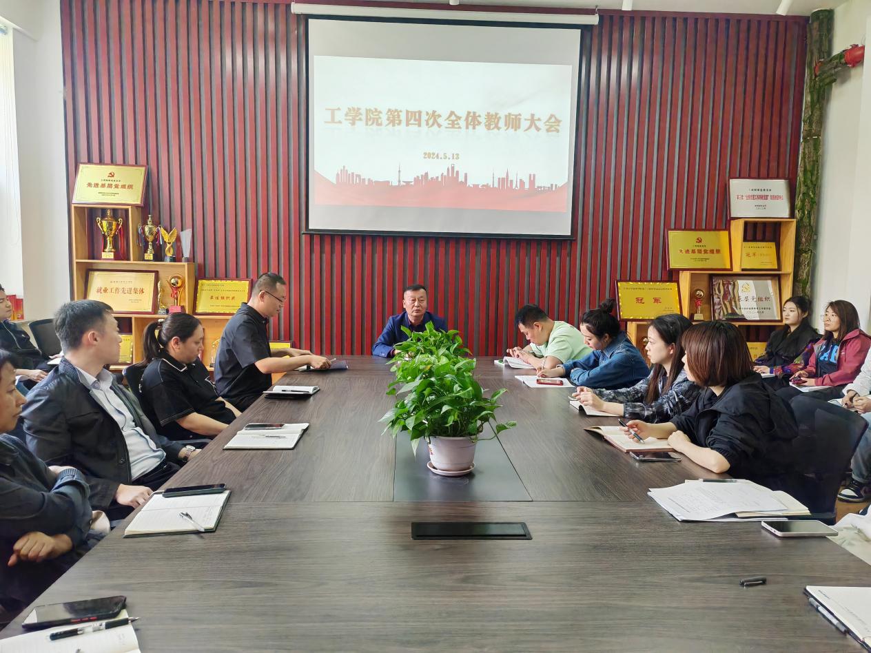 凝心聚力,砥砺奋斗,为推进学院高质量发展,工学院于5月13日在党建活动室召开本学期第四次全体教师大会。院长高峰主持会议,学院党总支书记凤龙、副院长董峻岩、各专业带头人及全体教师参会。