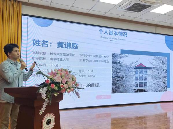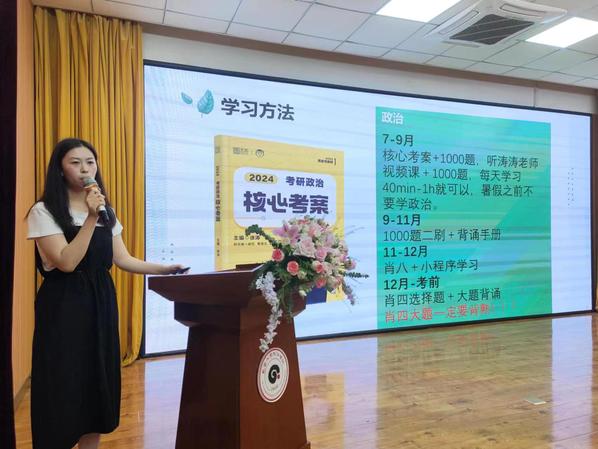 四位考研优秀学生代表结合自身考研经历,从院校选择、学习规划、复习方法、应试技巧和心态调整等方面进行了详细讲解。深入分析了各科目备考的技巧,包括英语语法和词汇的学习方法,数学方面的网课推荐,以及在考试中应对难题、巧妙分配时间的策略,鼓励同学们在备考阶段互相督促、共同进步,为考研学子们指明了明确的学习方向。