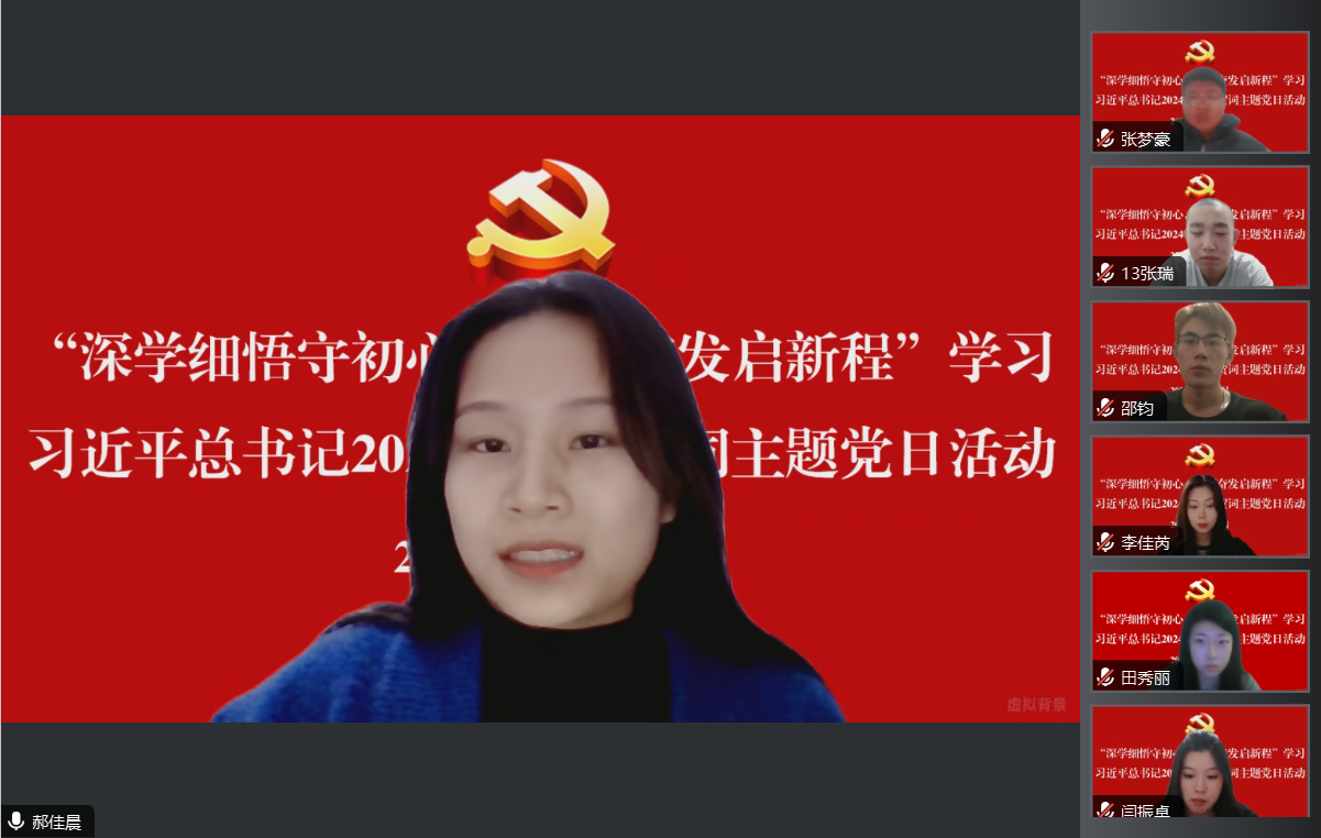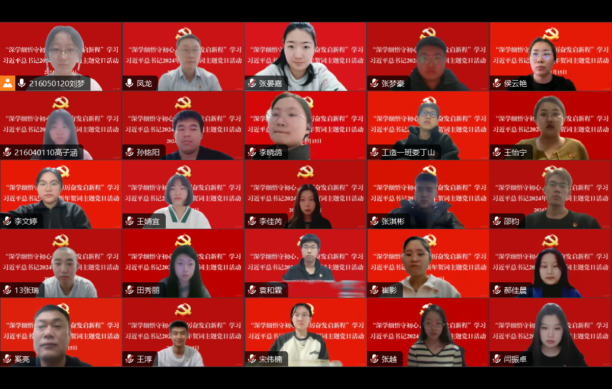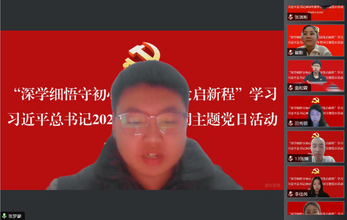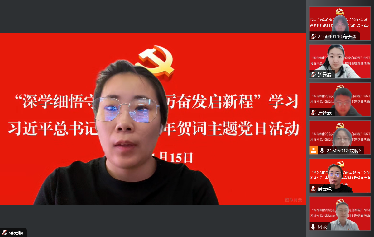 为深入学习贯彻习近平新时代中国特色社会主义思想主题教育,更好领会习近平总书记新年贺词的丰富内涵,激励全体党员在新的一年汲取奋进力量。1月15日,工学院学生党支部通过腾讯会议开展“深学细悟守初心,踔厉奋发启新程”学习习近平总书记2024年新年贺词主题党日活动。工学院党总支书记凤龙、学生党支部书记侯云艳、全体学生党员及入党积极分子参加本次活动。