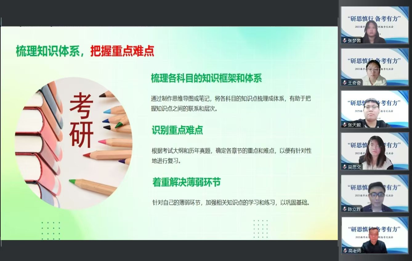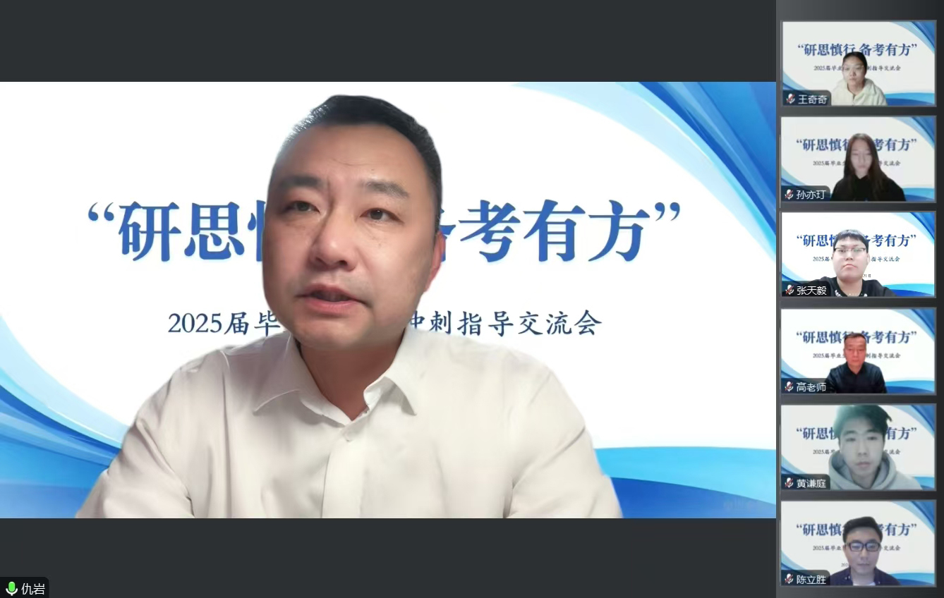 会上,教师陈立胜和郑浩东围绕冲刺阶段的复习规划、复习技巧和学习方法的抉择等方面对学生进行指导,并建议学生要全面梳理专业课考试大纲,对已经掌握的知识进行系统整理,从而全面搭建知识框架,形成逻辑清晰板块明确的知识体系。辅导员侯云艳针对考研冲刺阶段学生常见的畏难、焦虑、后劲不足带来的一系列心理问题,逐一提出针对性的应对方法。