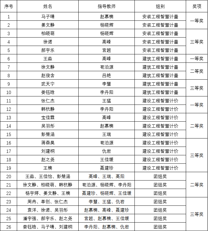 通过参加此次比赛,提高了学生计量、计价软件技术应用的实践能力,提升了专业兴趣,开拓了创新创业的眼界,进一步明确了指导教师建筑信息技能应用的教学实践方向。同时,也充分展现了工学院教育教学水平,彰显了校企合作协同育人工作取得的扎实成效。工学院将继续秉承培养高素质创新型人才的理念,鼓励更多学生积极参与各类学科竞赛,为推动学科建设与发展、提升学生综合素质而不懈努力。