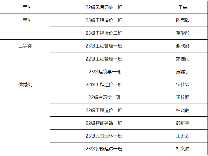 本次比赛秉承着公平、公正、公开原则评出一等奖一名、二等奖两名、三等奖三名、优秀奖六名获奖名单如下: