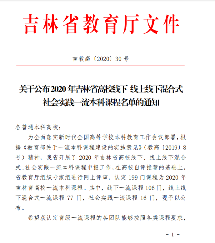 本课程从2014年开始讲授,已完成7轮授课, 2019年被确定为吉林省高校课程思政教学改革“学科育人示范课程”2020年被吉林省教育厅认定为吉林省高校线下一流本科课程