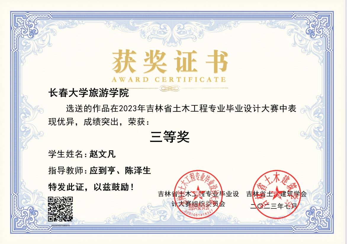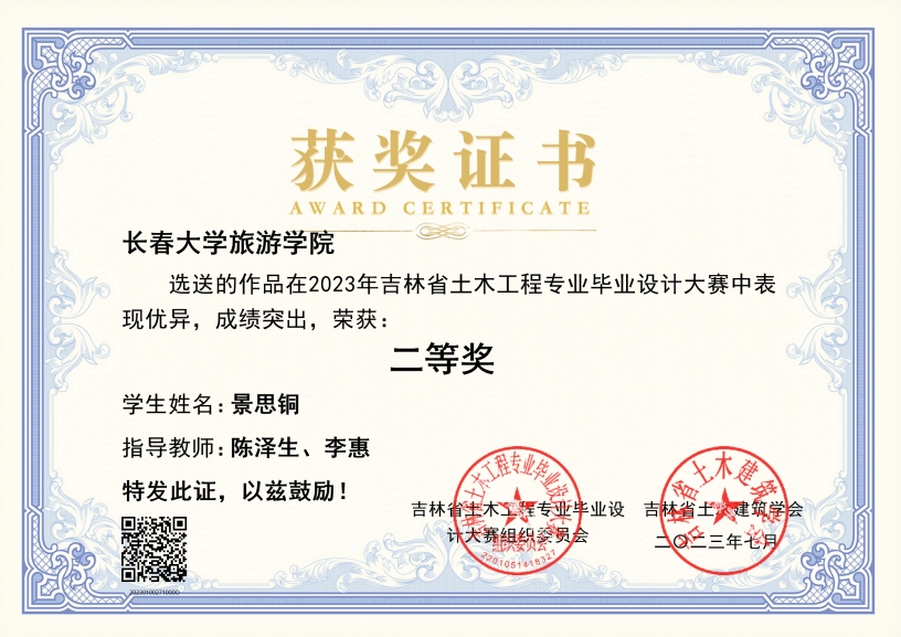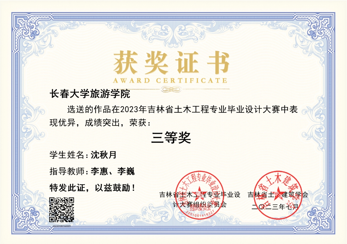 22.2023年第十三届吉林省土木工程专业毕业设计大赛二等奖一项,三等奖四项。景思彤、李思琦、沈秋月、赵文凡、宫健。