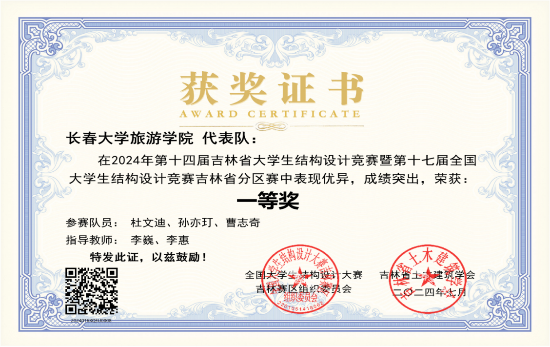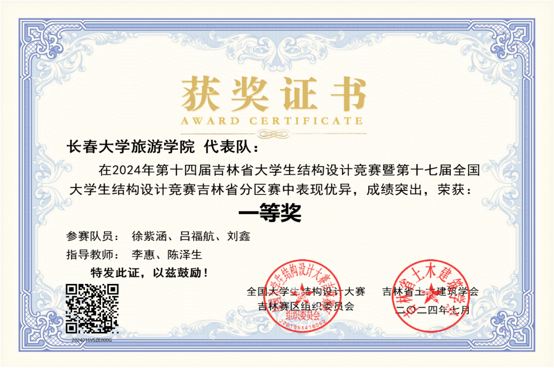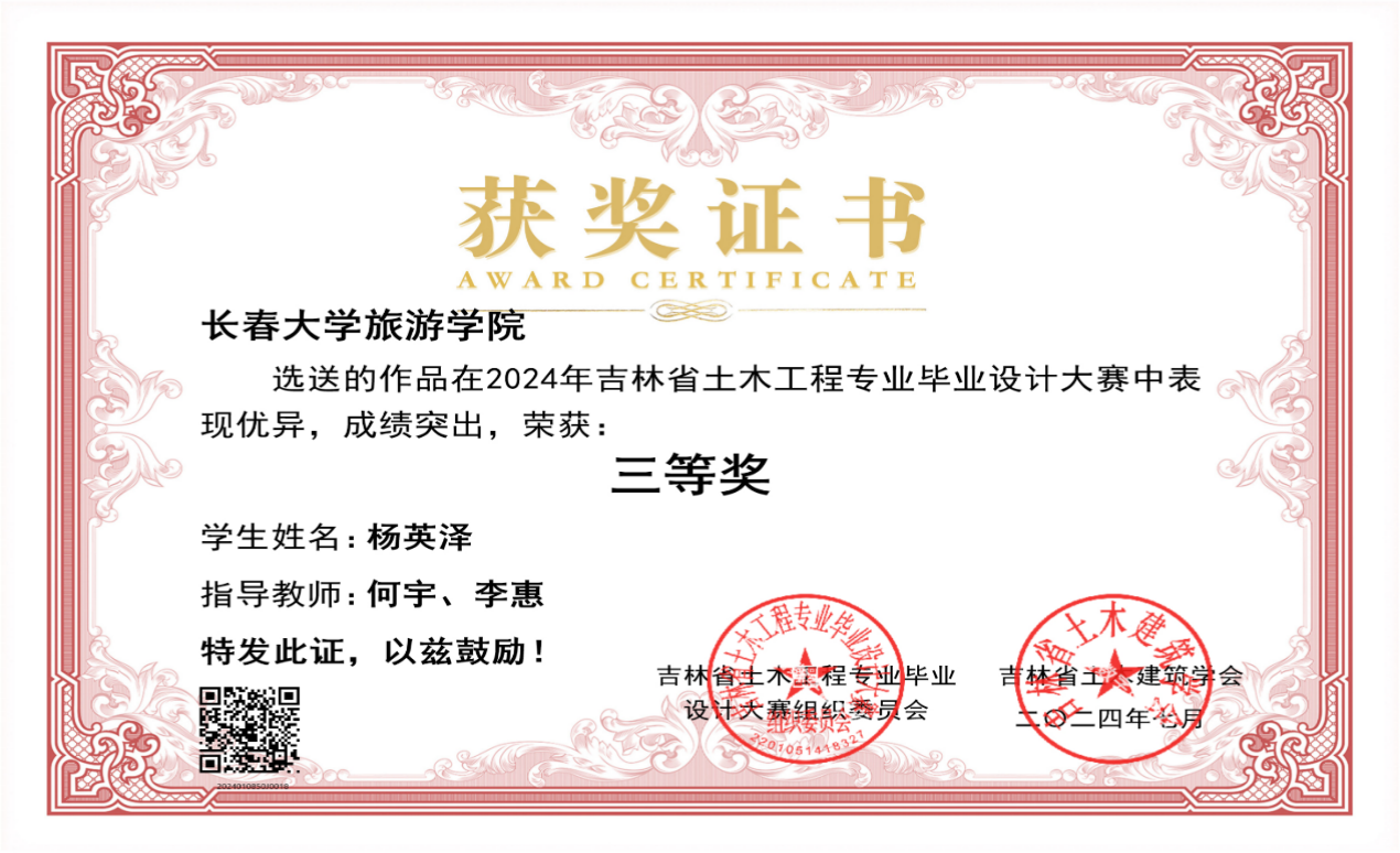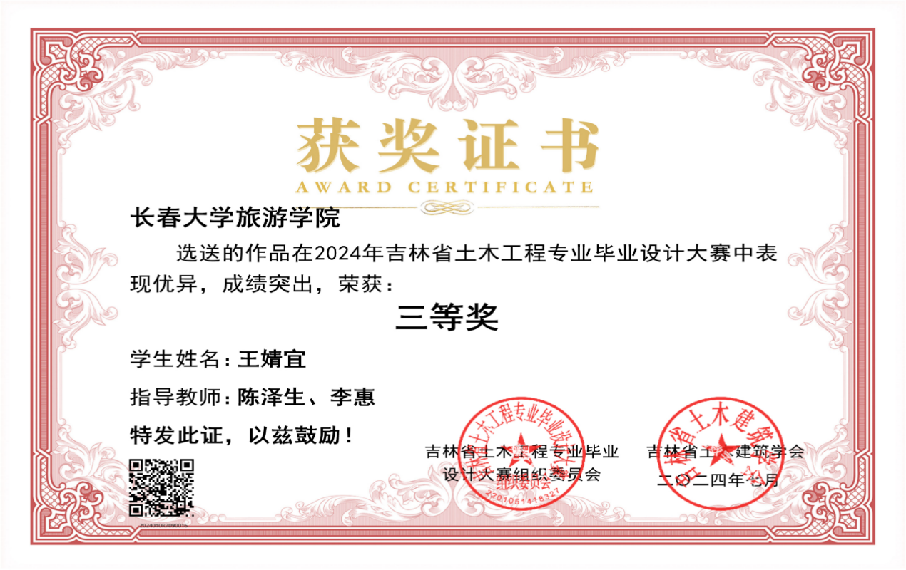 25. 2024年第十四届吉林省土木工程专业毕业设计大赛二等奖一项,三等奖四项。林志强、赵亚彤、王婧宜、杨英泽、邵钧。