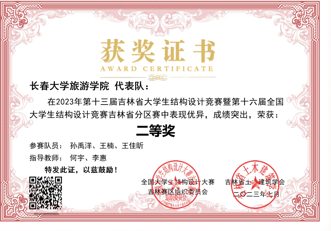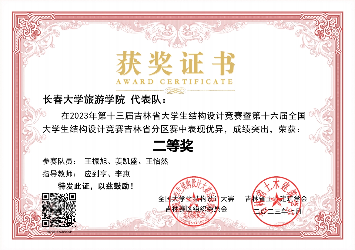 23.2023年吉林省大学生结构设计大赛,取得二等奖二项 ,并获优秀组织奖。王振旭、姜凯盛、王怡然、王楠、孙禹洋、王佳昕