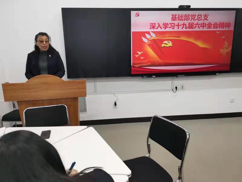 12月2日,基础部党总支在智慧教室102召开全体党员大会,共同学习十九届六中全会精神,会议由基础部党总支副书记马春娜主持,全体党员参加会议。