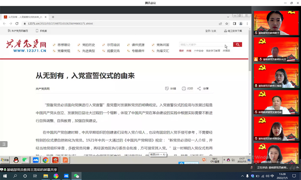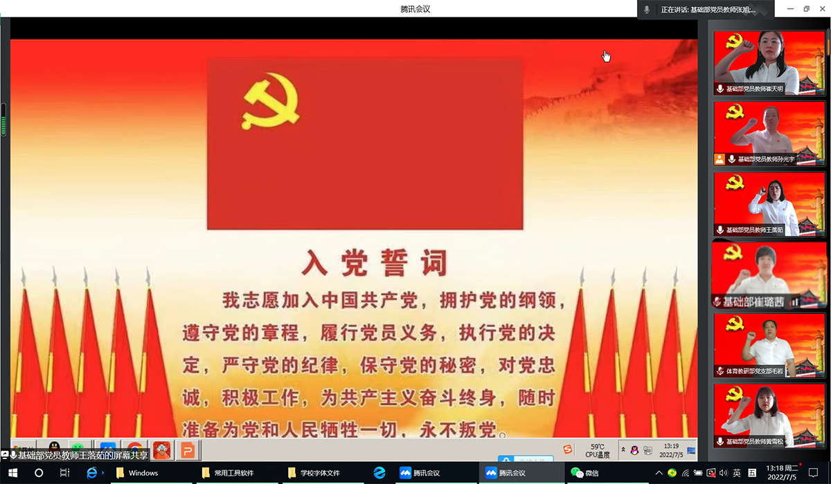 为庆祝中国共产党成立101周年,7月5日,基础部党总支开展“重温入党誓词 感悟初心使命”庆七一主题党日活动,用铿锵誓言向党的101岁生日献礼!基础部党总支21名党员出席了本次活动,活动由基础部党总支副书记王落茹主持。