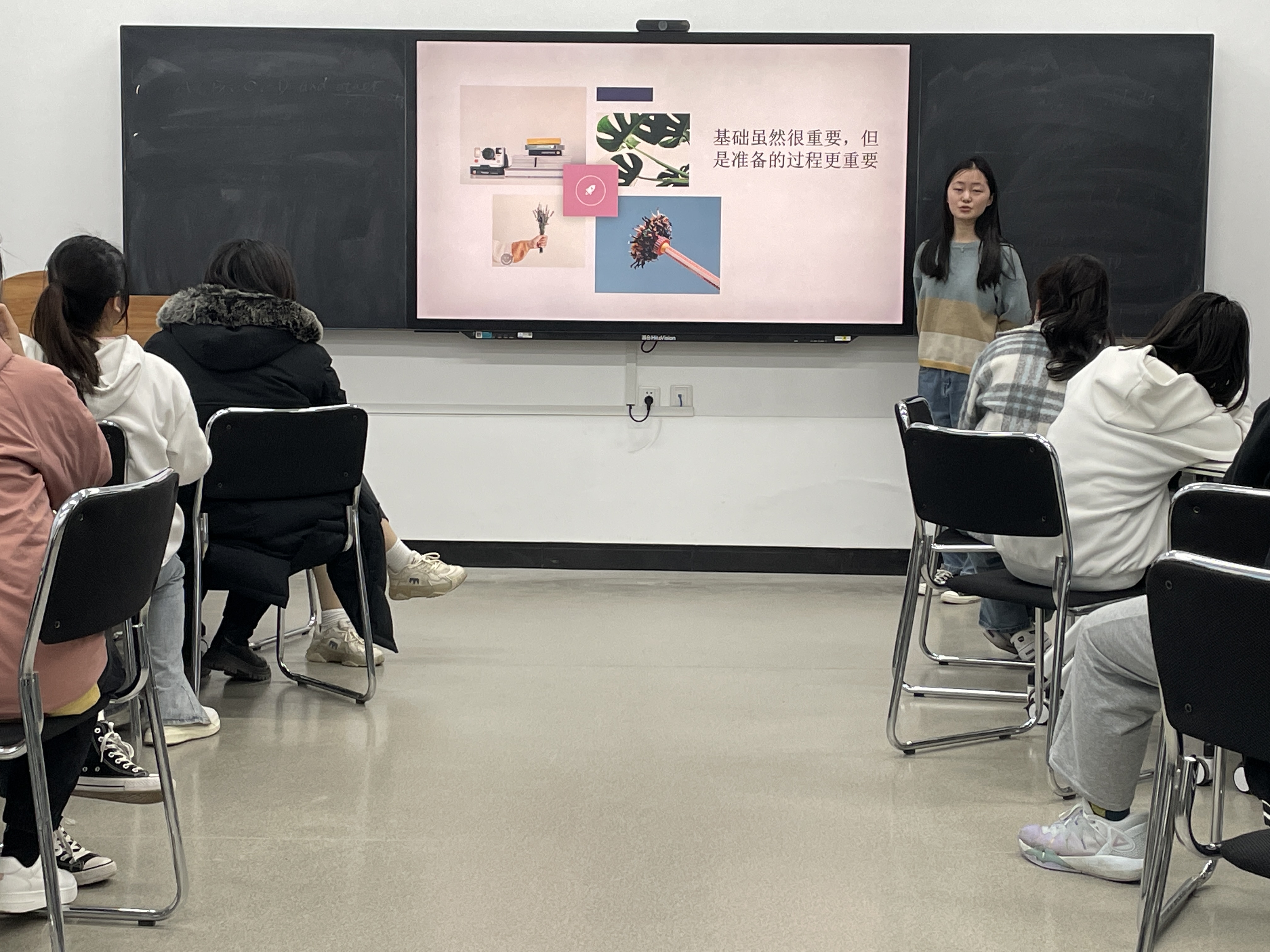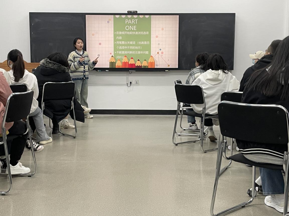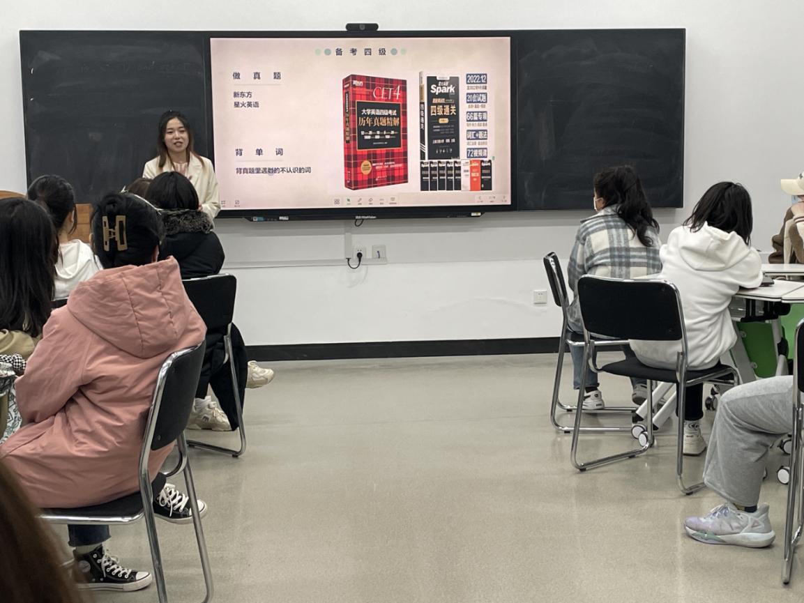 然后,五位优秀的学生代表,结合自己的亲身经历,分别从四级英语考试题型、词汇、考试心态和设备准备以及做题技巧等方面,向同学们介绍了她们的考试经验,并分别从作文、翻译、阅读、听力等部分与大家分享了她们对学习英语的理解和独到的学习方法。