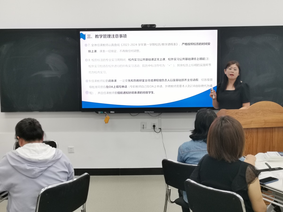 为使基础部每一位任课教师了解本学期工作的重点和工作方向,基础部主任齐洪英从9个方面总结上学期工作,详细解读2023级人才培养方案变更的部分(基础部课程名称、课程内容、课程学时),提醒各教研室主任按时完成2023级教学大纲修订,希望全体教师再接再厉继续发扬以往工作成绩,一分耕耘一分收获,号召基础部全体教师为基础部教学质量提高贡献力量。