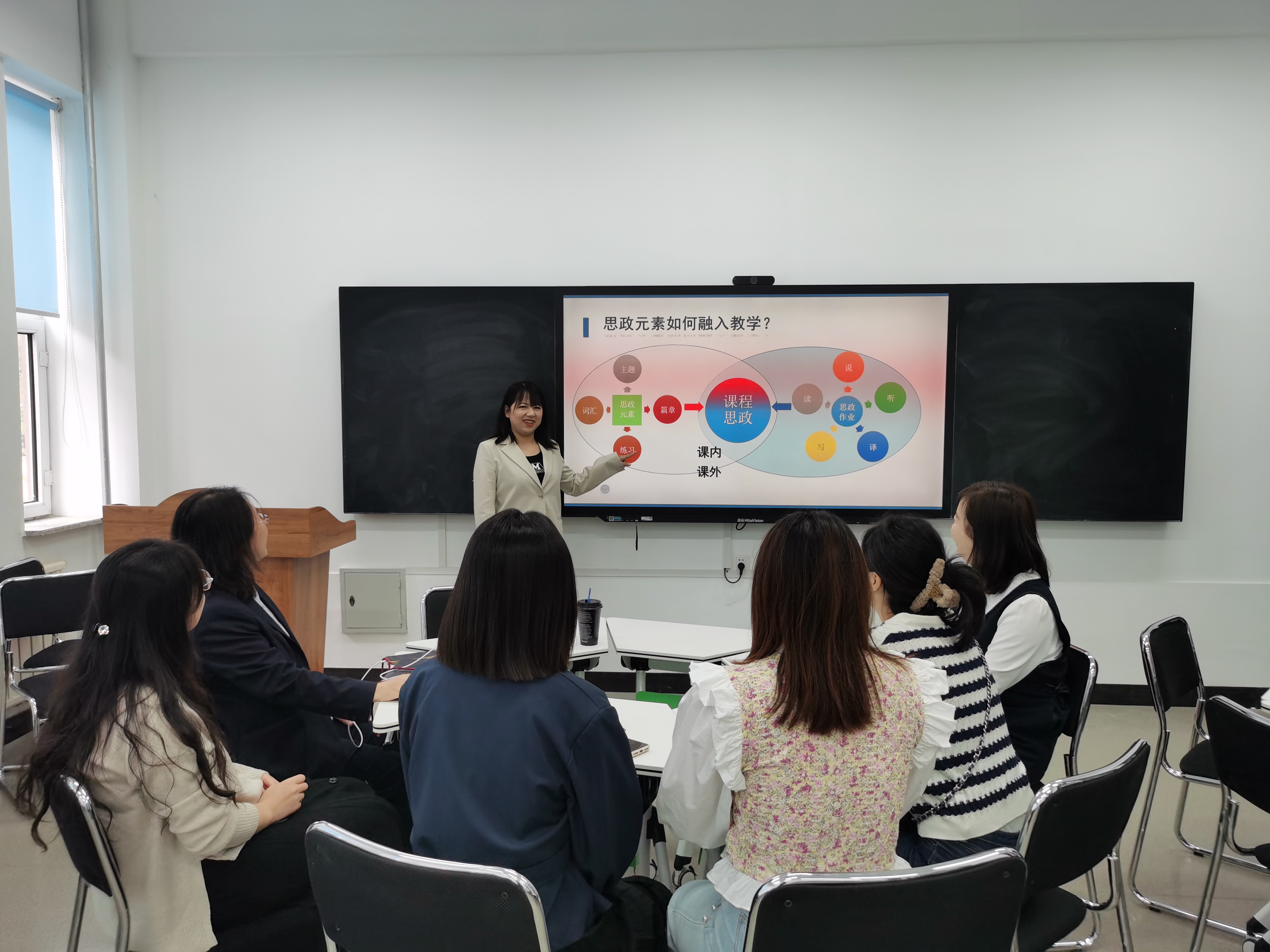 佟星老师对本单元的整体设计及相关备课思路进行说课,分享经验。她就课程的教学环节、教学方法、教学手段及教学重难点进行了详细讲解,增强了教学设计的针对性和实效性。交互式、浸润式、动态体验式的教学模式,能激发学生主动探索知识的动力和热情,让大学英语教育鲜活起来。