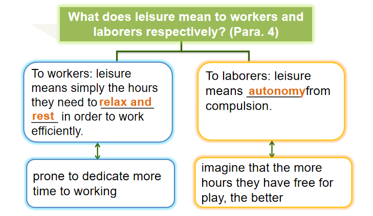 结合文章内容的对比结构,让学生从段落中找出关键对比话题,划分区别进行填空,突出工作者和劳役者在空闲时间的利用状态,工作满意度,个人价值感几个方面的特征。