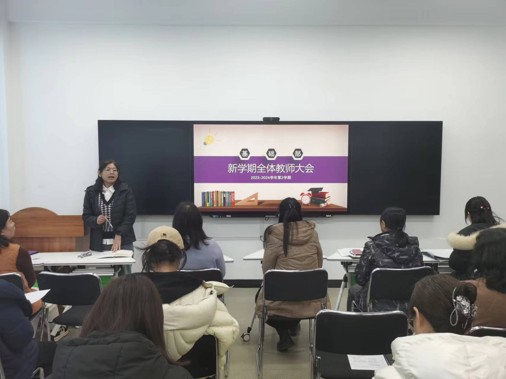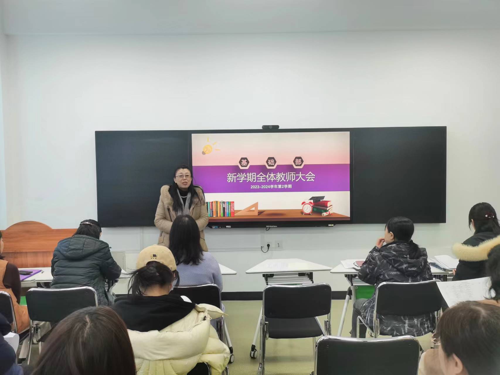 龙舞大地迎春至,生机盎然万物生。带着新希望,3月2日上午8:30,基础部在102召开新学期任课教师大会,大会由基础部主任齐洪英主持,共有46名教师(专职和外聘)参会。 基础部主任齐洪英从新学期新变化、教学管理注意事项、开学初工作安排3个方面统筹部署基础部新学期工作,教学质量的提升是任课教师工作的重中之重,希望每一位任课教师努力创新,认真备课,为基础部教学质量迅速提升助力。