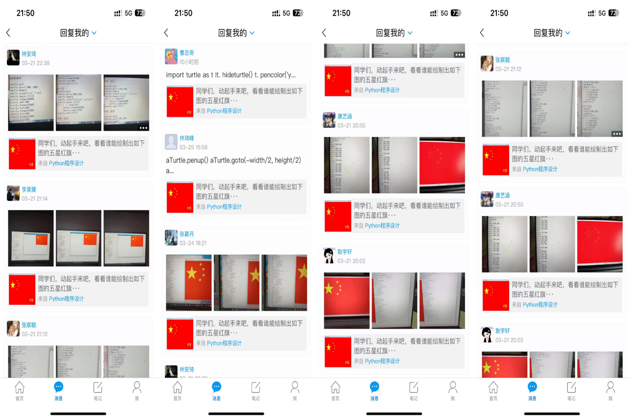 说明:此次实验主要设置了3个编程题,一方面考查学生turtle库的掌握程度,培养学生的严谨、认真的学习风格及良好的计算机编程思维;另一方便通过绘制五星红旗,萌发学生热爱五星红旗,培养学生爱国主义情怀。