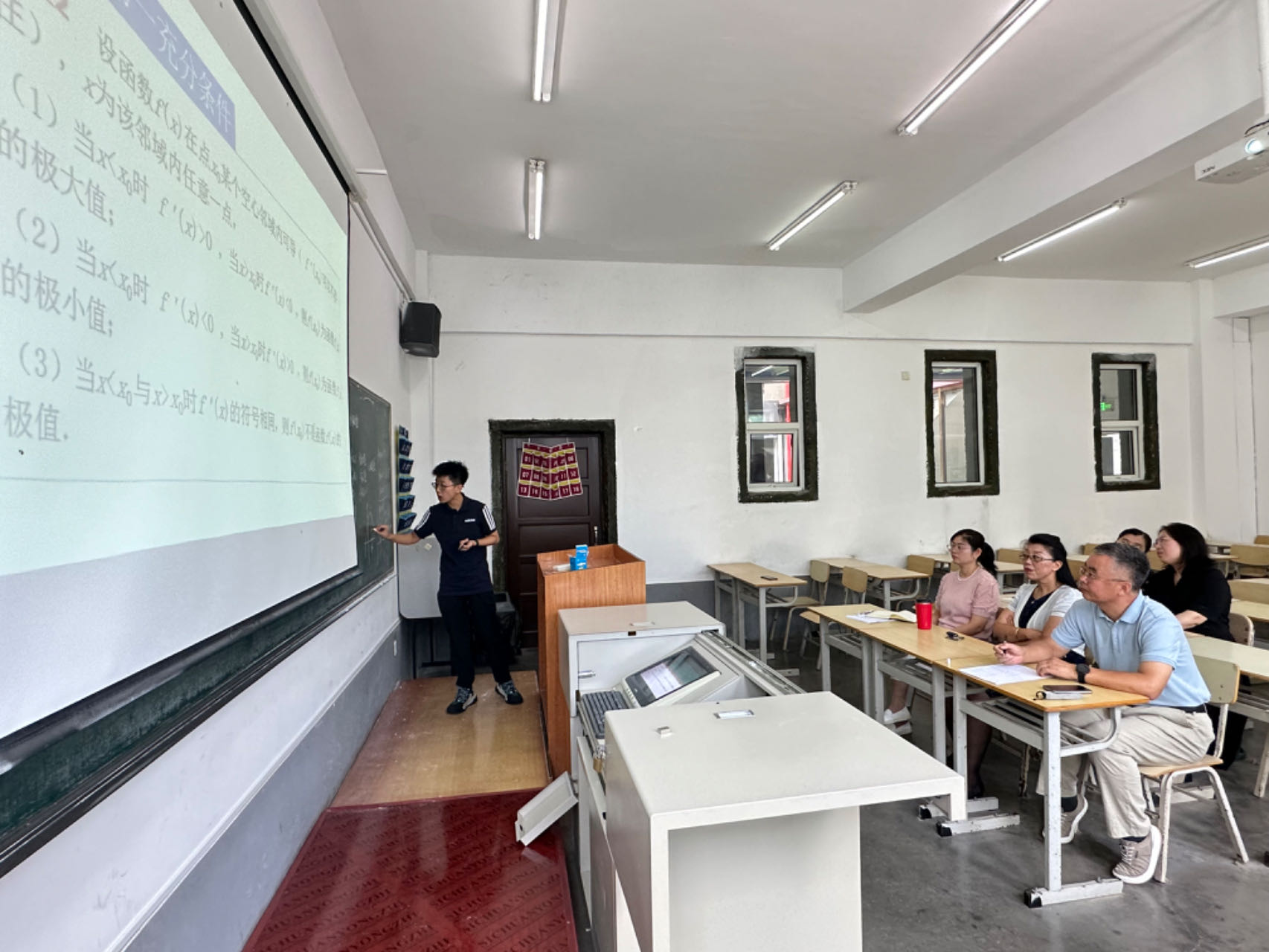 每位教师试讲结束后,都由指导教师、所在教研室主任或课程组负责人、经验丰富的高级职称教师、基础部主任、副主任一一进行细致的点评指导。针对高岩的试讲内容,李宣颖指出其整个教学设计不合理,课程导入举例不恰当,课程思政融入较生硬;孙光宇指出板书设计不合理;王落茹认为教学目标不明确,重点难点不够突出;崔天明指出其因PPT制作方面的不足导致教学设计不合理之处;齐洪英则从整个教学设计、教学目标、教学内容、课程思政、板书设计、PPT设计等多方面进行了点评指导。针对数学教研室的两名新入职教师的试讲,高云峰指出张志珲教学内容偏多,并给出删减建议,并走上讲台示范板书,针对霍愿媛试讲超时问题,建议删掉复习导入环节的部分内容,更改引例的图像以包含极值相关的多种情形,略讲例1和例2,增加例3的函数图像;许莹指出张志珲语速过快,吐字不清晰,板书书写规范性有待加强,语言应更精简一些,霍愿媛讲解引例作图时不够严谨,适当降低语速;王羽指出张志珲在讲解过程中过于繁琐,应加强逻辑性,霍愿媛语速过快,应适当加入提问,并给出学生思考环节;杜宇静指出张志珲要加强导入环节的问题引入,加强定理内容的严谨性,霍愿媛的引例不够精简;崔天明指出最好准备逐字逐句的讲稿,打磨细节,并详细指出了两位新教师试讲过程中存在的多处问题且都给出了具体的修改建议。